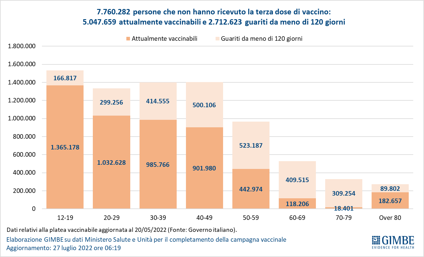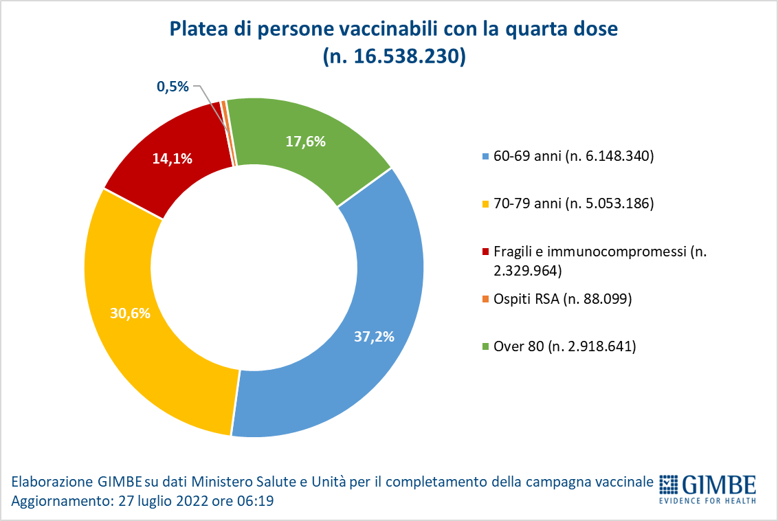 Vaccini: quarta dose. Secondo quanto disposto dalla Circolare del Ministero della Salute dell’11 luglio 2022 la platea di persone candidate a ricevere il secondo richiamo (quarta dose) – da effettuare dopo almeno 120 giorni dalla terza dose (primo richiamo) o dall’infezione post terza dose – è di oltre 16,5 milioni di persone.