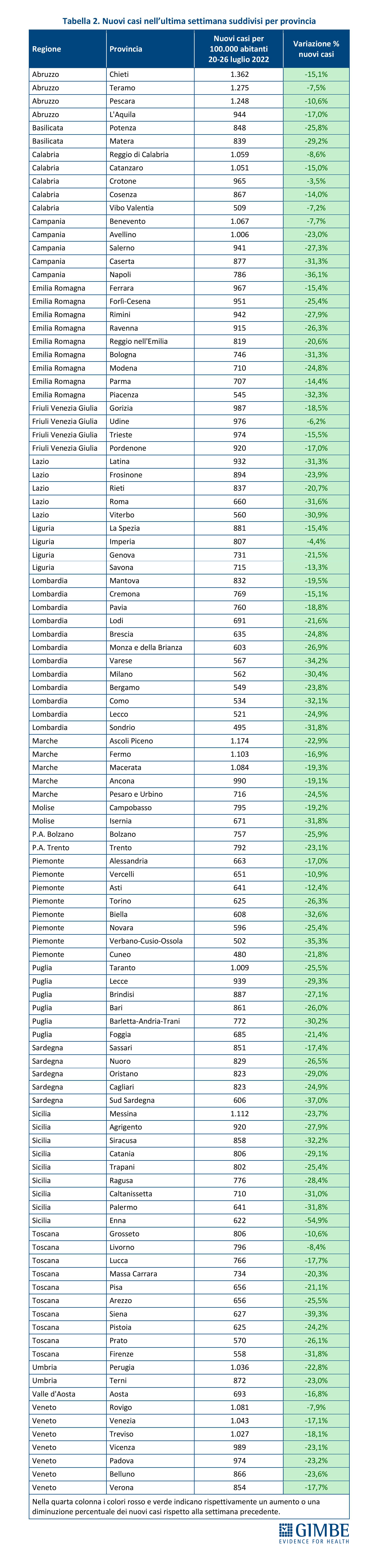 Nuovi casi. “Per la seconda settimana consecutiva – dichiara Nino Cartabellotta, Presidente della Fondazione GIMBE – il numero dei nuovi casi settimanali registra una flessione (-25% rispetto alla settimana precedente). Nella settimana 20-26 luglio i nuovi casi si attestano oltre quota 473 mila, con una media mobile a 7 giorni che sfiora i 68 mila casi al giorno”. Nella settimana 20-26 luglio in tutte le Regioni si registra una diminuzione percentuale dei nuovi casi (dal -11,1% della Calabria al -31,2% della Campania). Rispetto alla settimana precedente, in tutte le Province si rileva una diminuzione dei nuovi casi (dal -3,5% di Crotone al -54,9% di Enna). L’incidenza supera i 500 casi per 100.000 abitanti in tutte le Province tranne Sondrio (495) e Cuneo (480), mentre in 16 Province si registrano oltre 1.000 casi per 100.000 abitanti: Chieti (1.362), Teramo (1.275), Pescara (1.248), Ascoli Piceno (1.174), Messina (1.112), Fermo (1.103), Macerata (1.084), Rovigo (1.081), Benevento (1.067), Reggio di Calabria (1.059), Catanzaro (1.051), Venezia (1.043), Perugia (1.036), Treviso (1.027), Taranto (1.009) e Avellino (1.006) (tabella 2).