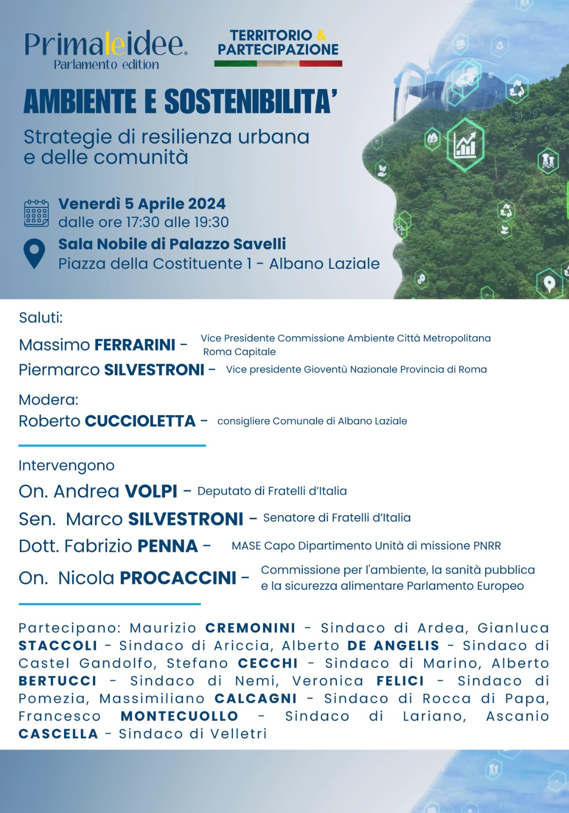 “Ambiente e Sostenibilità, strategie di resilienza urbana e delle comunità" è questo il titolo dell'evento promosso da "PrimaLeIdee - Parlamento Edition” e da “Territorio e Partecipazione” che si terrà Venerdì 5 Aprile 2024 presso la Sala Nobile di Palazzo Savelli ad Albano Laziale.