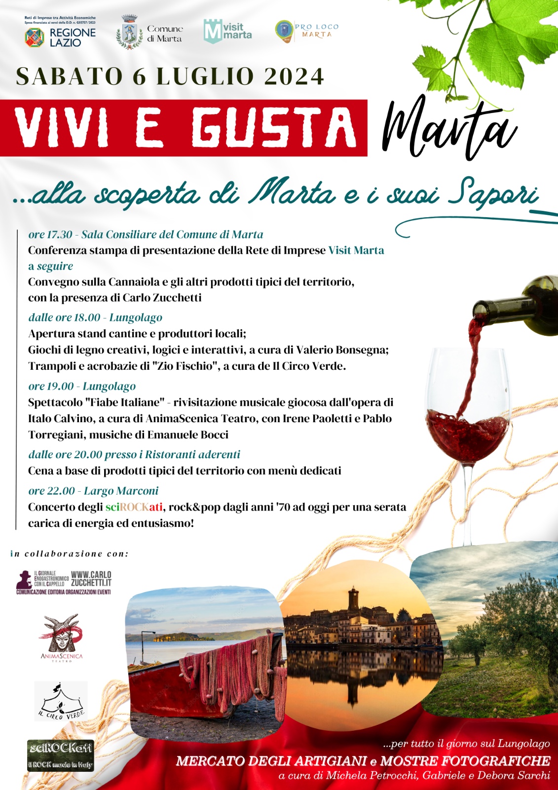 - Sabato 6 luglio 2024 alle ore 17,30 nella Sala Consiliare del Comune prenderà il via l’evento “Vivi e Gusta Marta -…. alla scoperta di Marta e dei suoi sapori”. Il programma si aprirà con la conferenza stampa di presentazione della Rete di imprese ‘Visit Marta’ nata dall’unione di circa sessanta imprese aderenti con il Comune e con il supporto economico della Regione Lazio. Dopo la presentazione della Rete seguirà un Convegno sulla Cannaiola e gli altri prodotti tipici del territorio.