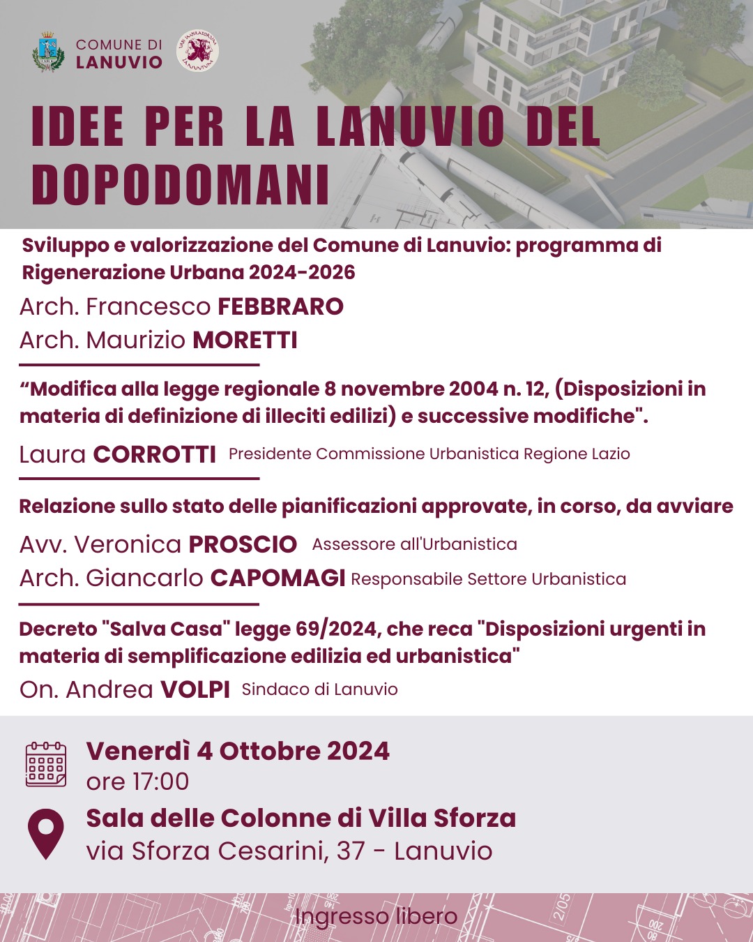 Si terrà venerdì 4 ottobre presso la Sala delle Colonne di Villa Sforza a Lanuvio il convegno "Idee per la Lanuvio del Dopodomani". All'incontro, organizzato e promosso dall'amministrazione comunale di Lanuvio, parteciperanno il Sindaco On. Andrea Volpi, la Presidente Commissione Urbanistica della Regione Lazio Laura Corrotti, l'Assessore all'Urbanistica Avv. Veronica Proscio, il Responsabile comunale del Settore Urbanistica Arch. Giancarlo Capomaggi e gli architetti Francesco Febbraro e Maurizio Moretti.