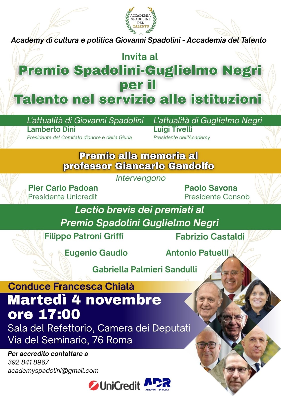 Un Premio per il Talento nel servizio alle istituzioni dedicato a Giovanni Spadolini e a Guglielmo Negri.