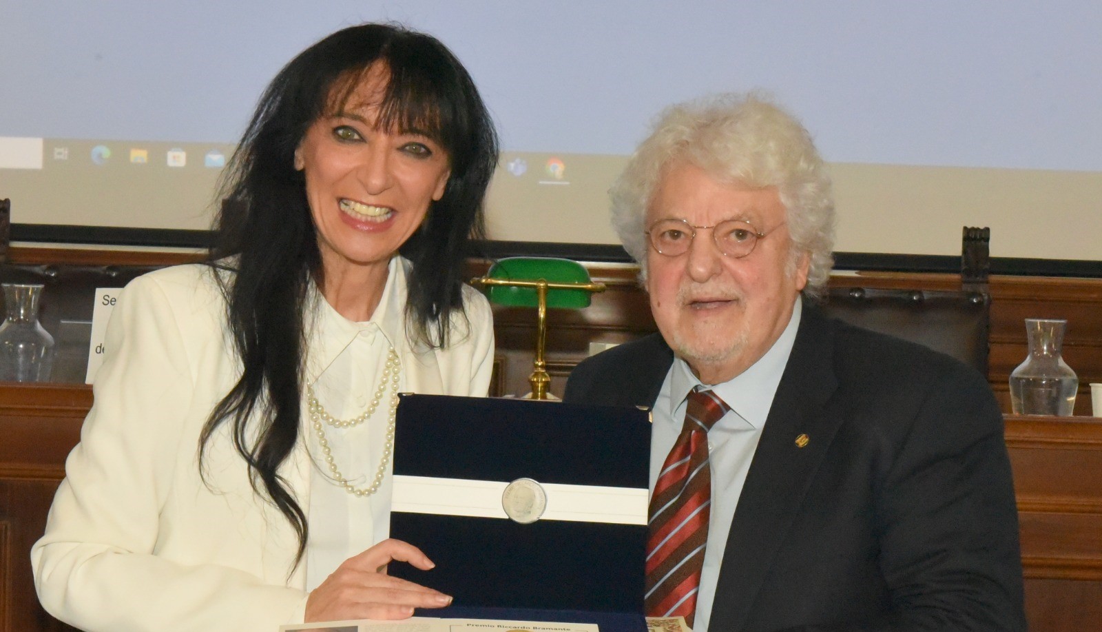 La consegna è stata fatta dalla Presidente Ester Campese con il Prof. Gianluigi Rossi - Professore emerito di “Storia dei trattati e Politica Internazionale” e di “Storia ed Istituzioni dei Paesi Afro-Asiatici” presso l’Università “La Sapienza” di Roma e Direttore dell’Osservatorio Mediterraneo - Istituto San Pio V. Riceve per il suo contributo alla Cultura e ed alla Storia a cui è stato attribuito un riconoscimento, consistente in una moneta celebrativa coniata appositamente per la Cerimonia.