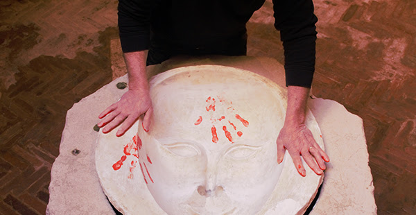 Ad essere proposto è un percorso espositivo di impronte e di maschere, maschere-impronte e impronte-maschere, attraverso l’esposizione di calchi negativi in alabastro, grandi mascheroni, quindi positivi, in cartapesta e resina, disposti sia al piano terra che al primo piano.