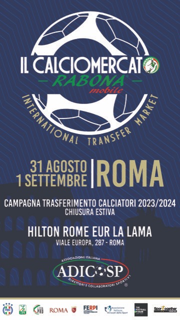 ’Associazione Italiana Direttori e Collaboratori Sportivi (ADICOSP) organizza nei giorni giovedì 31 agosto e venerdì 1 settembre 2023 all’Hotel Hilton Roma Eur La Lama in viale Europa, 287 – Roma, la fase finale della sessione estiva del Calciomercato International Transfer Market Rabona Mobile 2023-2024.