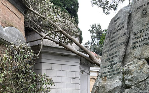 Come documentano queste eloquenti foto, questa è la situazione in cui si trova oggi la tomba di Nathan e dei suoi familiari: a circa un metro di distanza si è spezzato alla base un grosso ramo di un albero, adagiandosi su un'adiacente cappella in stato di abbandono. Ma che aspetta l'AMA a rimuovere il legname al più presto? La Comunità Ebraica non avrebbe forse nulla di ridire?