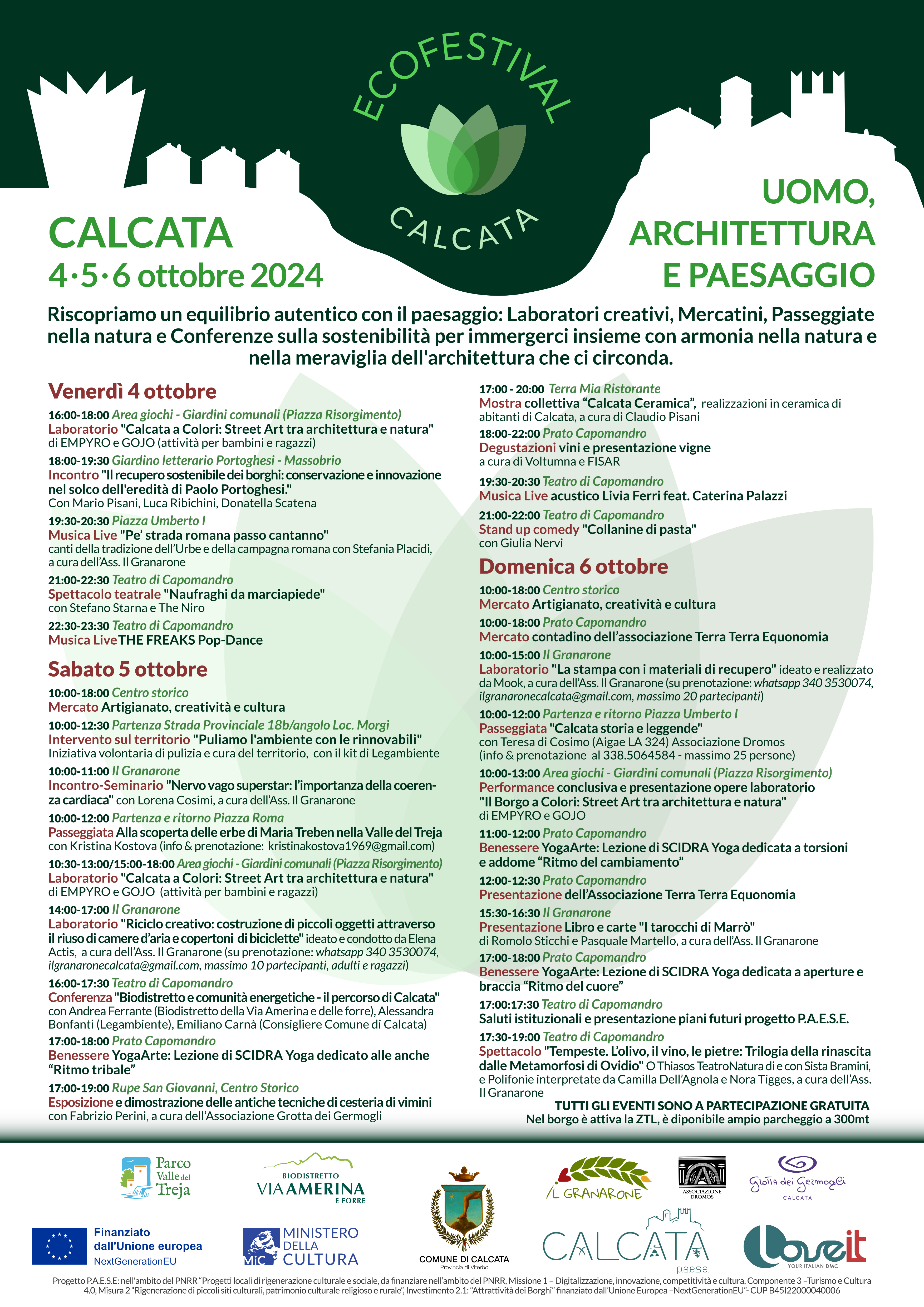 Nelle giornate di venerdì 4 ottobre, sabato 5 e domenica 6, Calcata ospiterà incontri, spettacoli, laboratori, seminari. Un programma che si disloca nel paese e che vedrà coinvolte nuove sedi: la Casa Giardino Portoghesi Massobrio, dove avrà luogo lo speciale incontro di apertura "Il recupero sostenibile dei borghi: conservazione e innovazione nel solco dell'eredità di Paolo Portoghesi". Evento che introduce il tema di questa edizione, la relazione “Uomo, architettura e paesaggio”, e che sarà anche l’occasione per visitare lo splendido giardino e la recente sede museale.