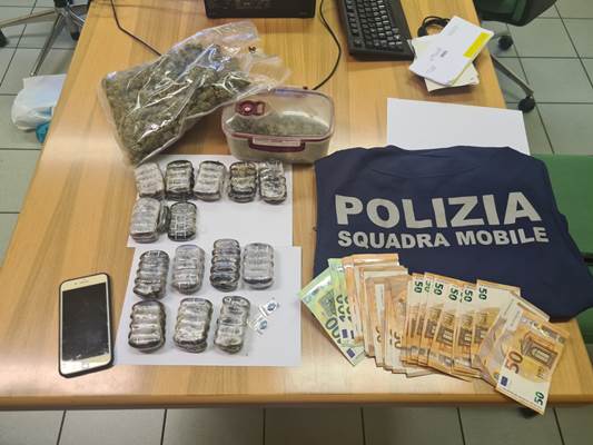 Il possesso di tale sostanza – peraltro con un peso che mal si attagliava ad un uso esclusivamente personale – ha spinto gli operatori ad approfondire la perquisizione, con l’impiego di una unità cinofila già presente in città per uno dei molteplici controlli straordinari del territorio svolti dalla Questura.
