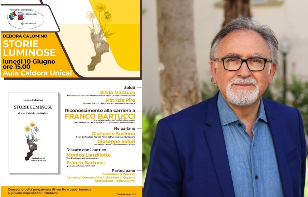 Alla manifestazione in programma per lunedì 11 giugno, nella storica Aula Caldora dell’Ateneo, faranno da padrone di casa Patrizia Piro, Prorettore del Campus calabrese, e la professoressa Silvia Mazzuca, Presidente dell’Associazione Amici dell’Unical. Una cerimonia in cui verrà ufficialmente presentato un libro sulle eccellenze del Camus,”Storie Luminose”, di Debora Colamino, ma che nei fatti sarà invece la celebrazione ufficiale del giornalista Franco Bartucci, per oltre 40 anni responsabile dell’Ufficio Stampa dell’Ateneo.