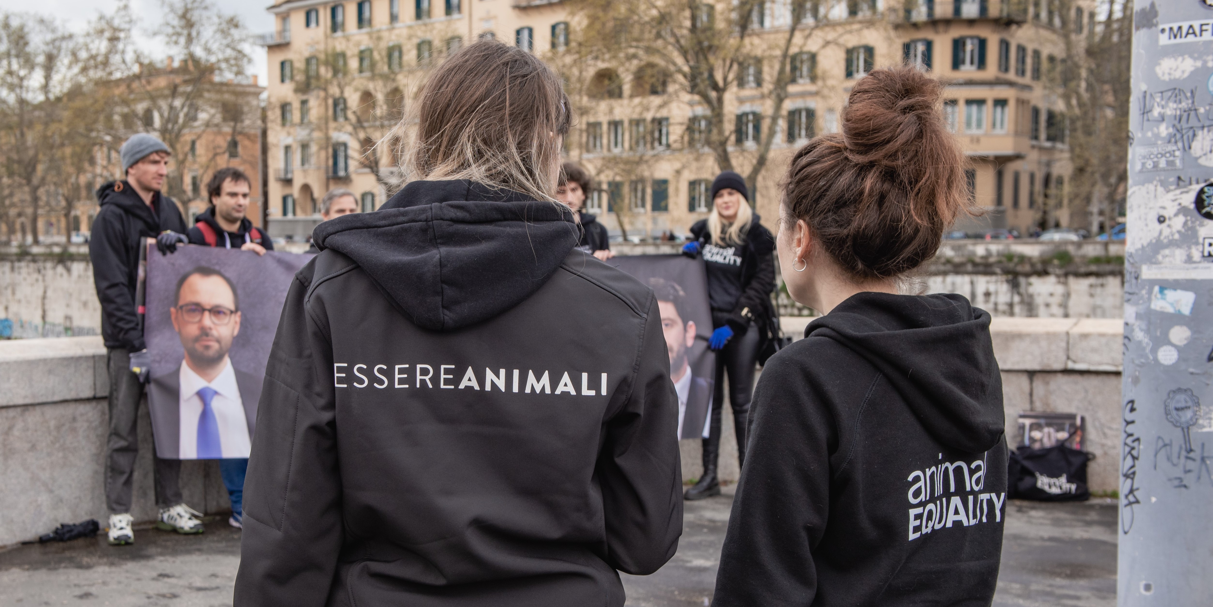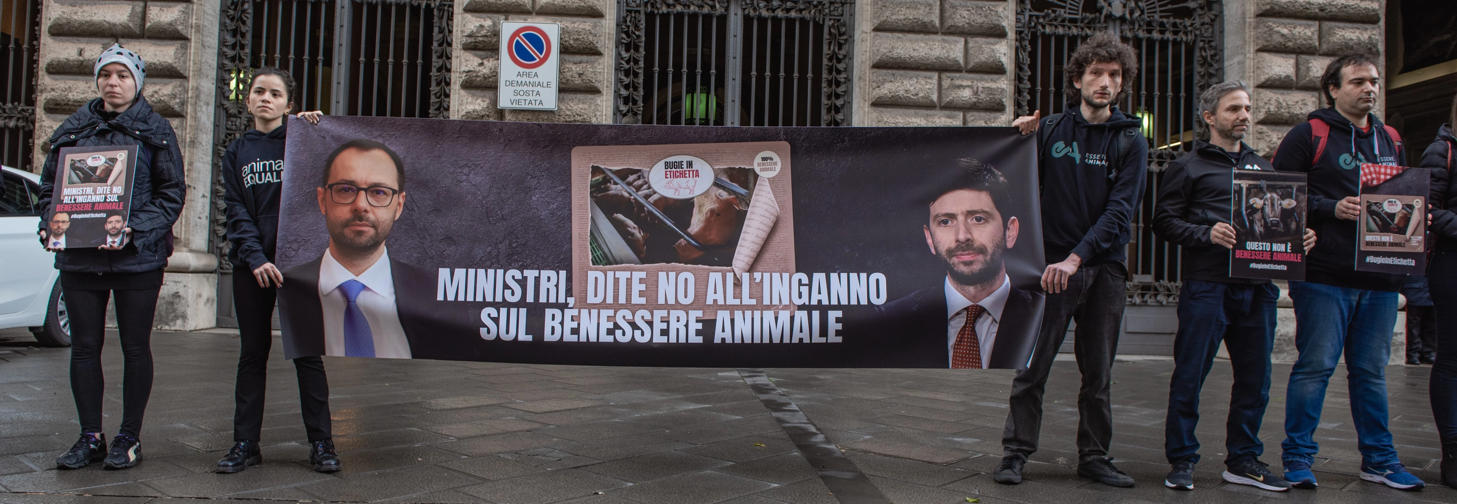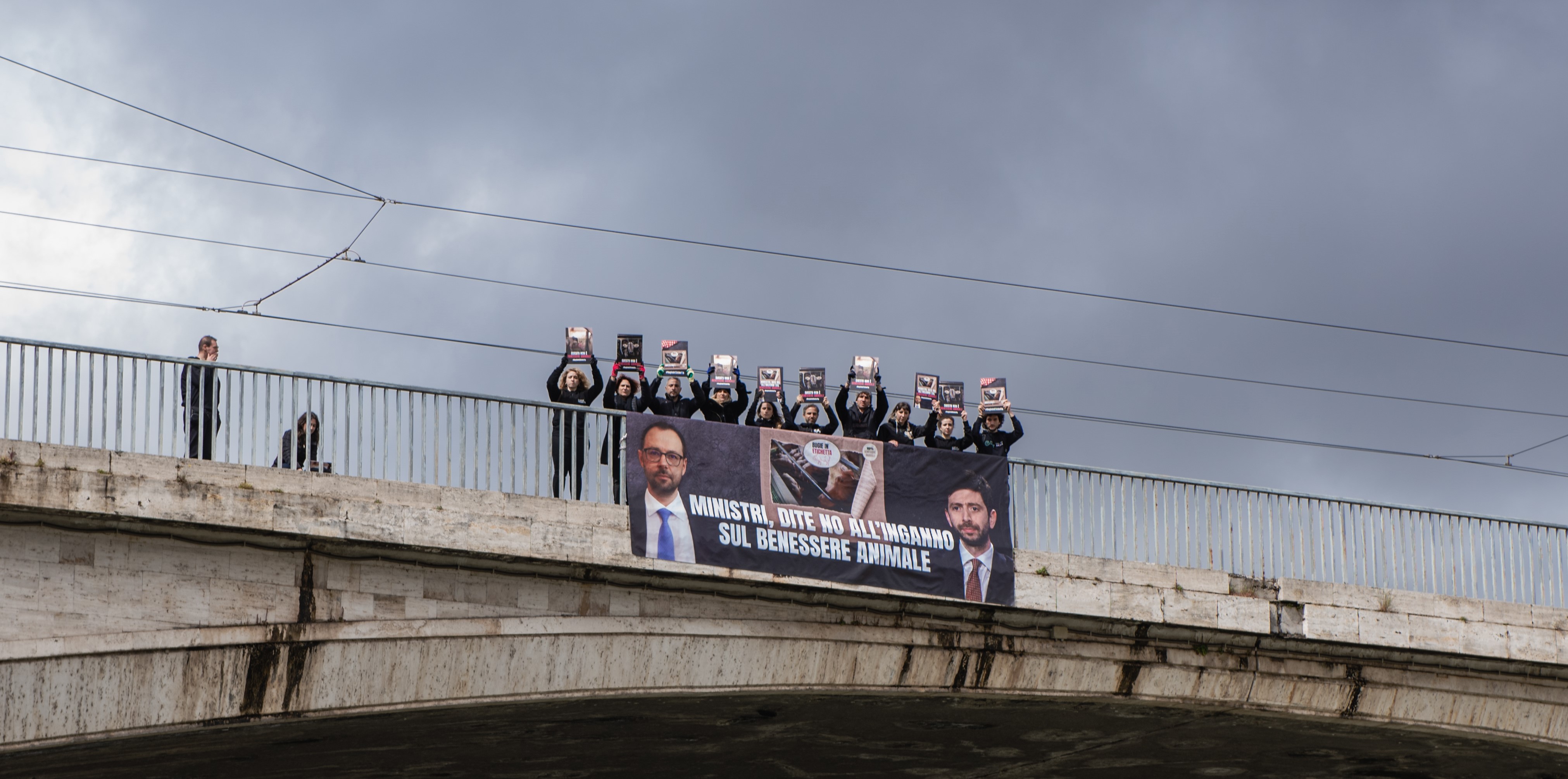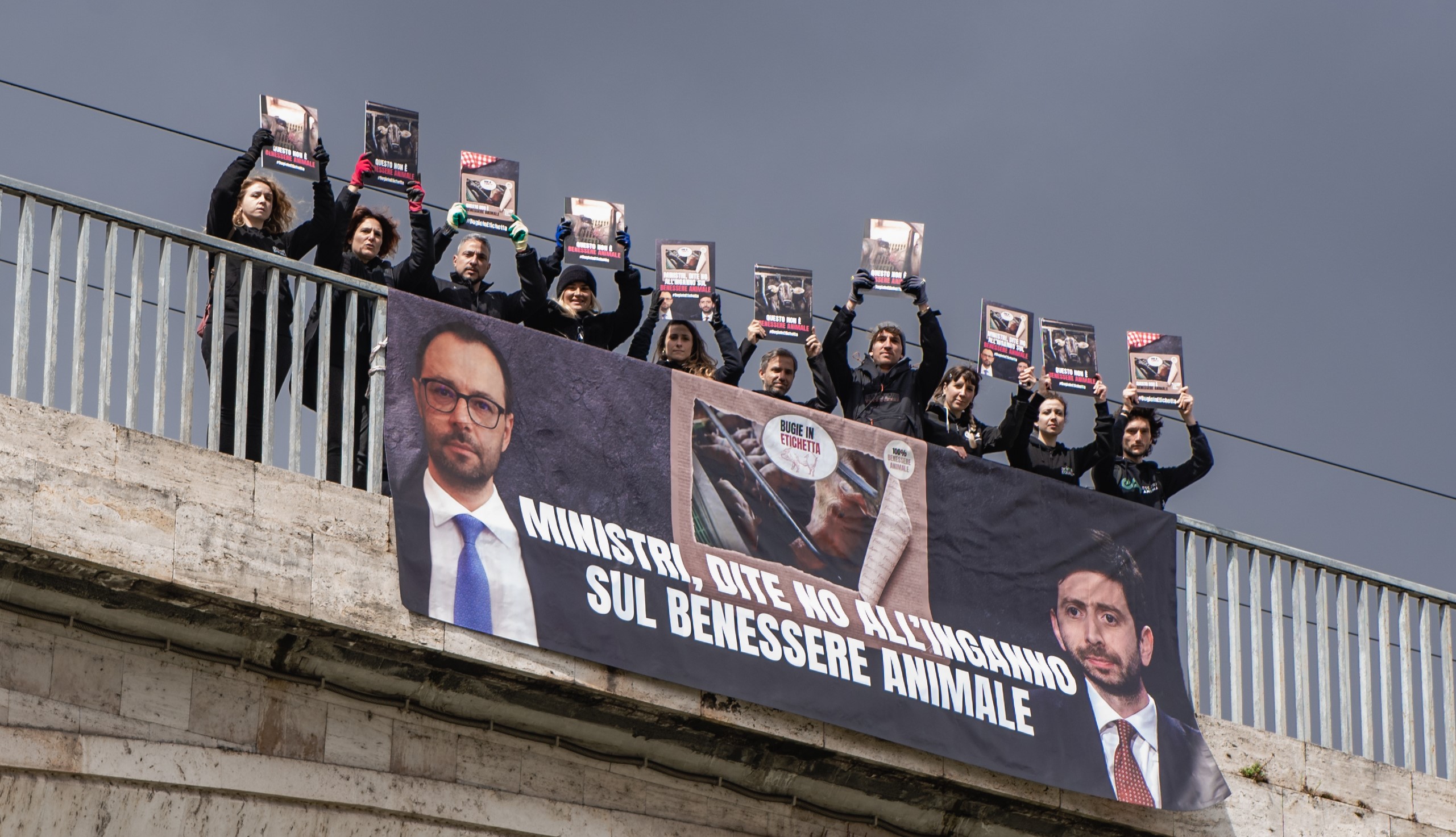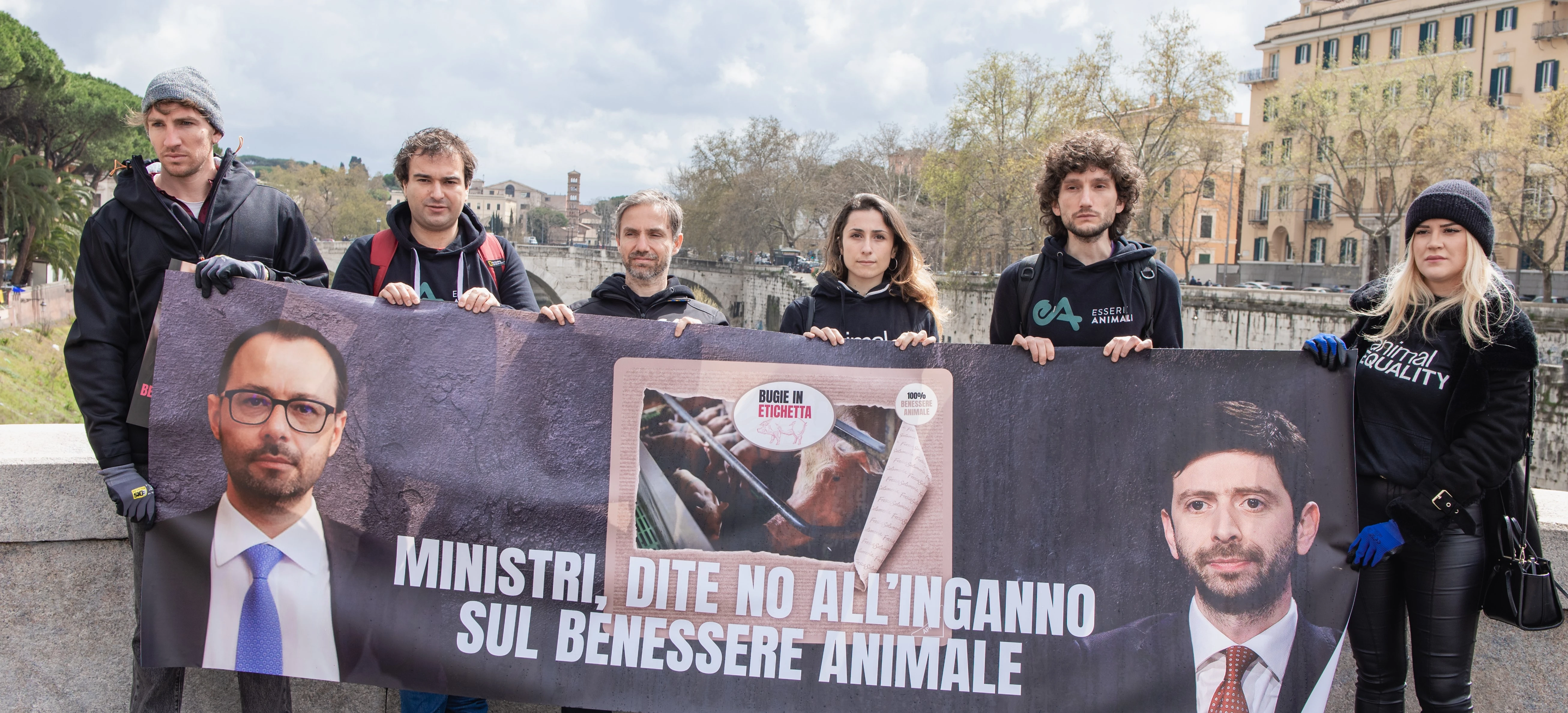 La protesta si è svolta a Roma, davanti alle sedi dei Ministeri coinvolti nella definizione della proposta di etichettatura nazionale sul benessere animale, ed è stata accompagnata da un banner drop esibito lungo il Ponte Garibaldi con la richiesta di fermare le #BugieInEtichetta.