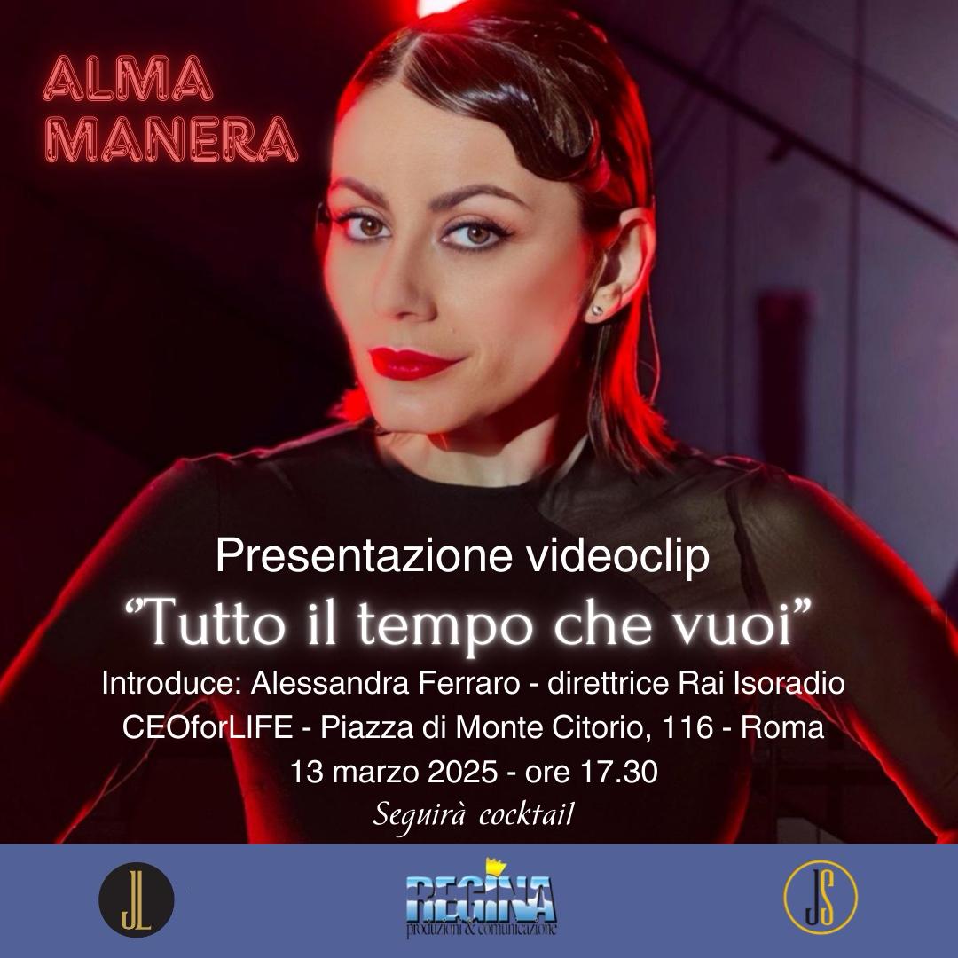 Dal 7 marzo scorso è disponibile su tutte le piattaforme digitali "Tutto il tempo che vuoi", il nuovo brano della talentuosa Alma Manera, una delle eccellenze italiane della musica. La canzone è stata scritta con il cantautore Giovanni Segreti Bruno, autore anche della musica, e Maria Pia Liotta. Un arrangiamento curato da Davide De Blasio, con mix e mastering affidati a Emanuele Donnini, danno ulteriore spessore alla produzione firmata Joseba Label di Gianni Testa e Regina Produzioni e Comunicazione, con distribuzione Virgin Music Italia (Universal).