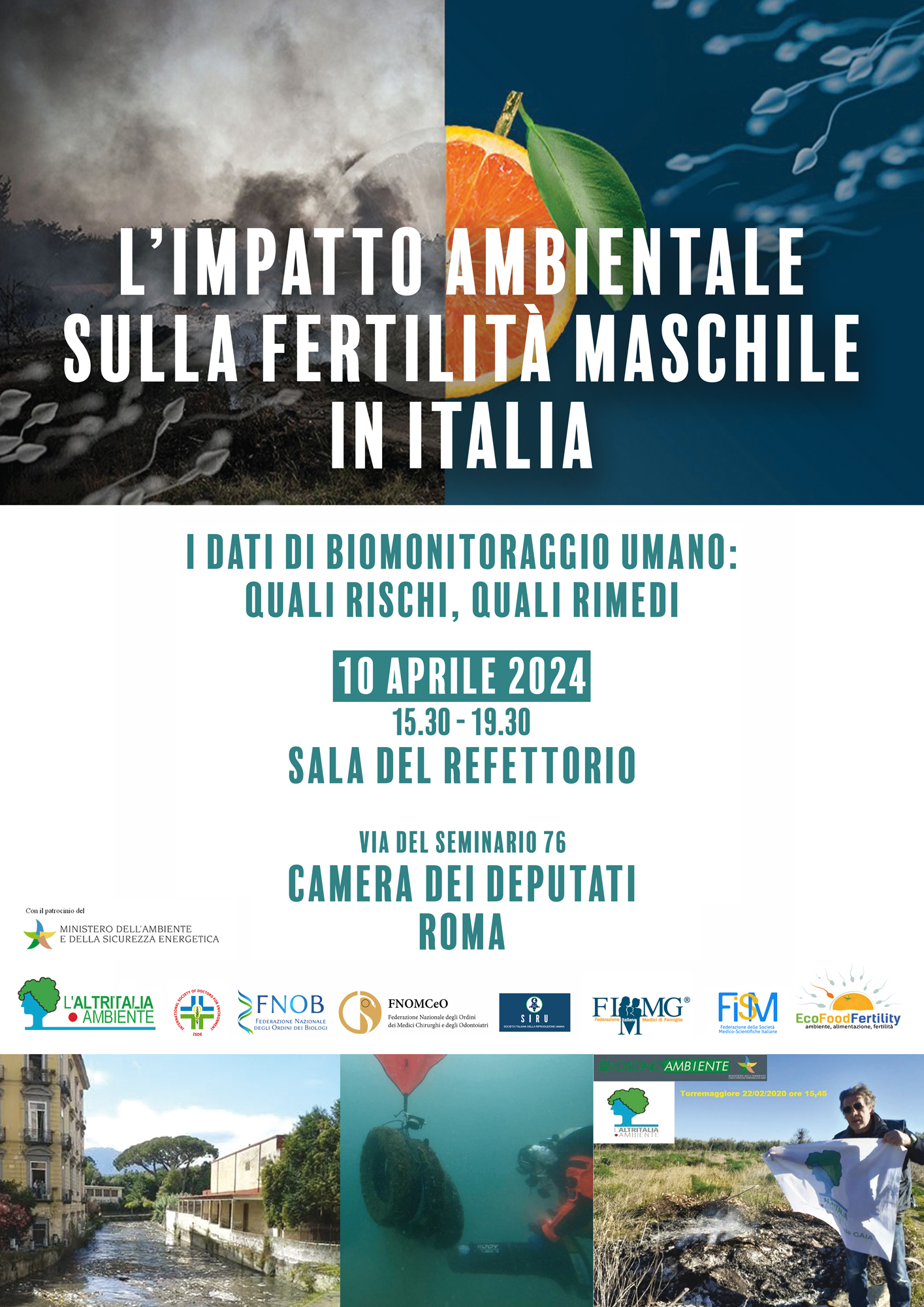 https://webtv.camera.it/evento/25080 sarà possibile seguire sul proprio PC o sul proprio cellulare i lavori. Tra i politici vi sarà Francesco Emilio Borrelli, deputato AVS e membro della Commissione d’Inchiesta ciclo rifiuti e illeciti ambientali; Manfredi Potenti, senatore della Lega e membro della commissione ambiente; Marco Furfaro deputato PD e membro della Commissione Affari sociali; Andrea Quartini, deputato M5S e membro della commissione parlamentare di inchiesta sulle condizioni di lavoro in Italia, sullo sfruttamento de sulla tutela della salute e della sicurezza nei luoghi di lavoro pubblici e privati; Carmela Auriemma, deputata del M5S e membro della commissione d’inchiesta ciclo rifiuti e illeciti ambientali; Gianfranco Rotondi, deputato di Fd’I e vicepresidente della commissione politiche dell’Unione Europea e Andrea De Maria, deputato PD e segretario della commissione parlamentare di inchiesta sulle condizioni di sicurezza e sullo stato di degrado delle città e delle loro periferie. Interverrà inoltre Paolo Maddalena, vicepresidente emerito della Corte Costituzionale. Per L’Altritalia Ambiente invece il presidente nazionale, il responsabile del sud Italia Ruggiero Del Grosso, Maria Sorrentino, coordinatrice del comitato scientifico e Laura Barnaba del comitato scientifico. Previsti poi interventi di Francesco Giardina, direttore di Coldiretti Bio; Liliana La Sala del Ministero della Salute; Marco Martuzzi, direttore Dipartimento Salute/Ambiente Istituto Superiore di Sanità; Filippo Anelli, presidente Federazione dell’Ordine dei Medici Chirurghi e Odontoiatri; Vincenzo D’Anna, presidente Federazione Nazionale Ordine dei Biologi (FNOB) e Francesco Macrì, Segretario Federazione Italiana Società Medico Scientifiche (FISM). Il convegno, fortemente voluto anche dal presidente nazionale di EcoffodFertility Luigi Montano, mira a evidenziare come i fattori di inquinamento ambientale vadano a incidere pesantemente sulla fertilità maschile e quindi sul calo di natalità dovute all’inquinamento dell’ecosistema.