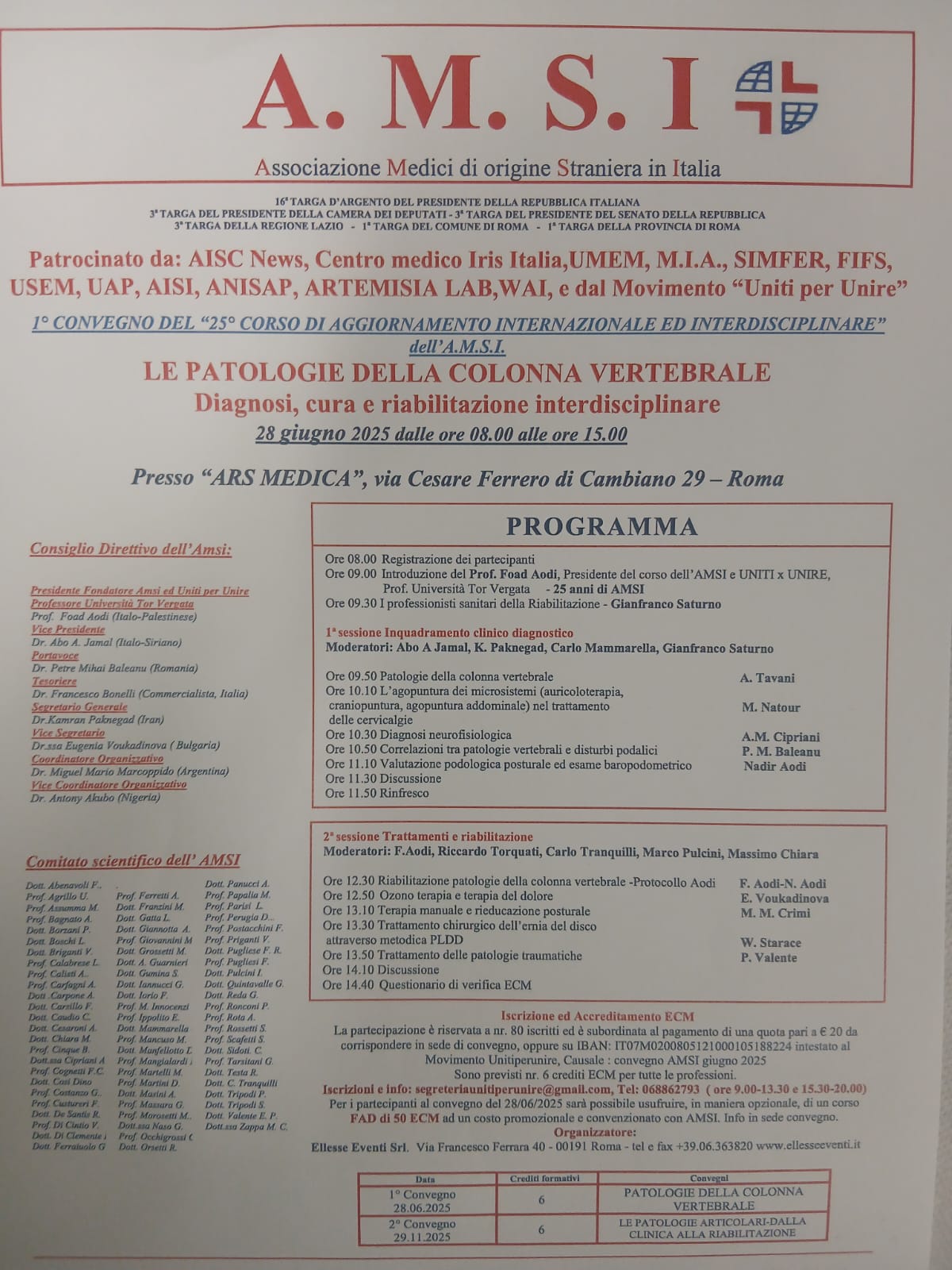 “Siamo orgogliosi di presentare il primo convegno del 25° corso Amsi, che fin dal nome riflette la nostra identità: un corso internazionale e interdisciplinare, accreditato per tutte le professioni sanitarie. Come Amsi, dal 2000 a oggi abbiamo promosso oltre 1.222 convegni, congressi e iniziative, organizzate direttamente o in collaborazione con le associazioni e comunità aderenti al Movimento Uniti per Unire. AMSI è socio fondatore del Movimento e sostiene, con oltre 78 dipartimenti professionali, il dialogo interculturale, l’integrazione, la cooperazione internazionale e la salute globale.