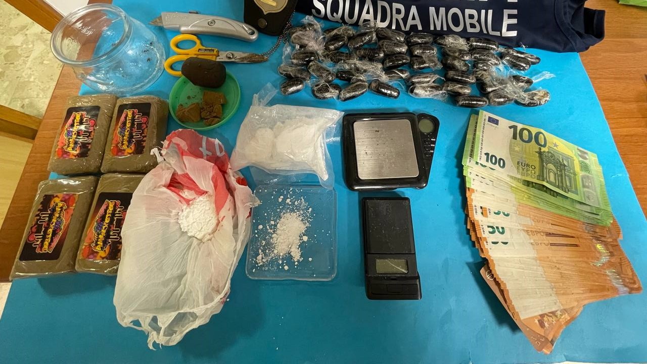 In tutto veniva rinvenuta e sequestrata quasi un chilogrammo di hashish ed oltre un etto di cocaina, una piccola quantità di marijuana e 5.350 euro in contanti, provento dell’attività di spaccio, bilancini di precisione e materiale atto al confezionamento e allo smercio delle droghe.