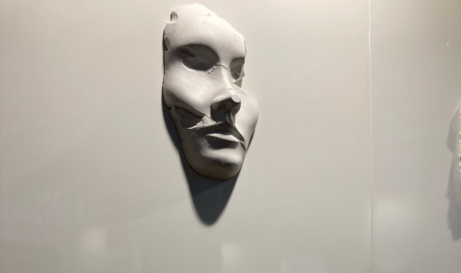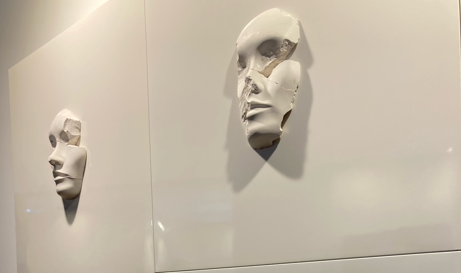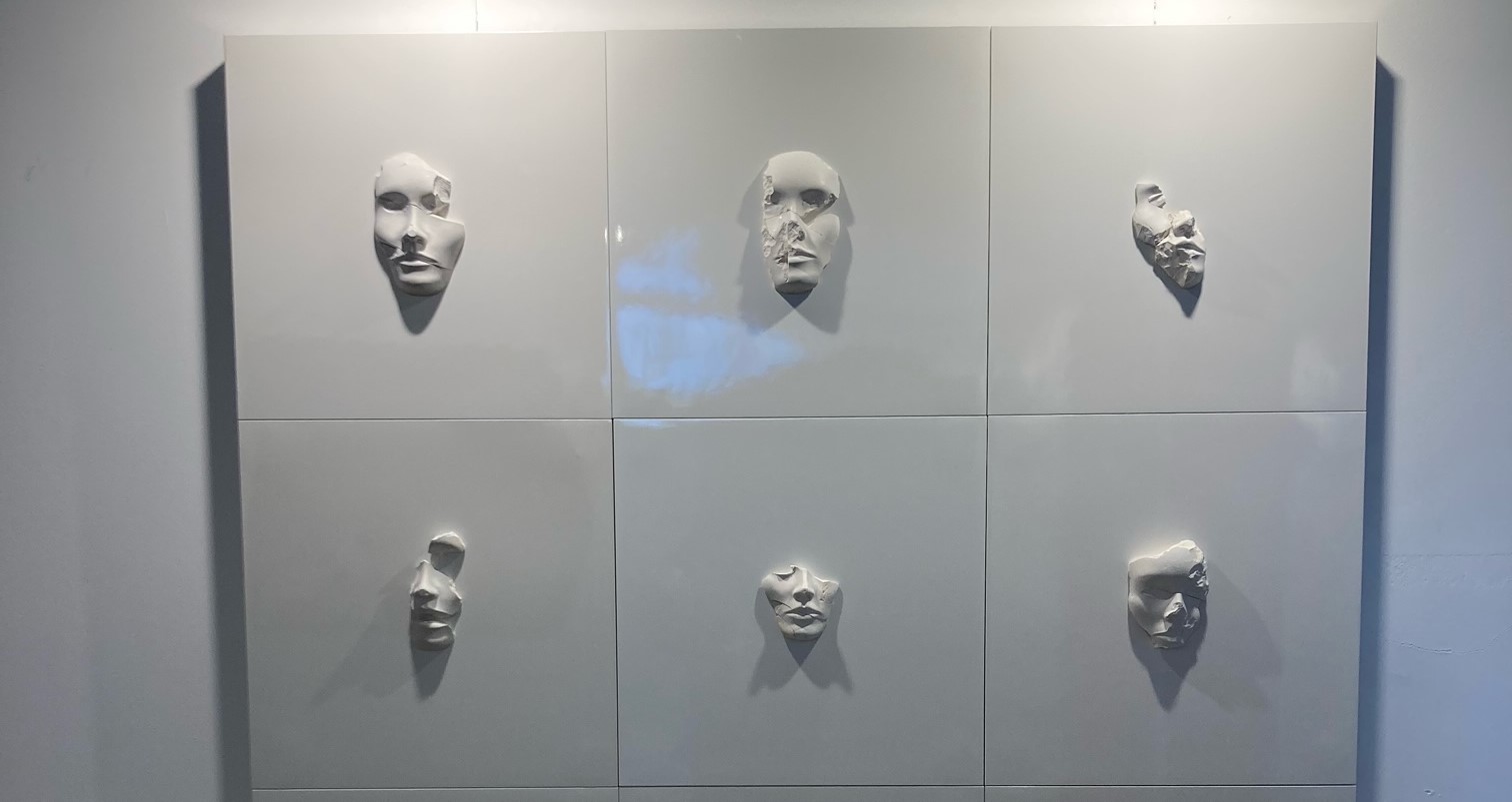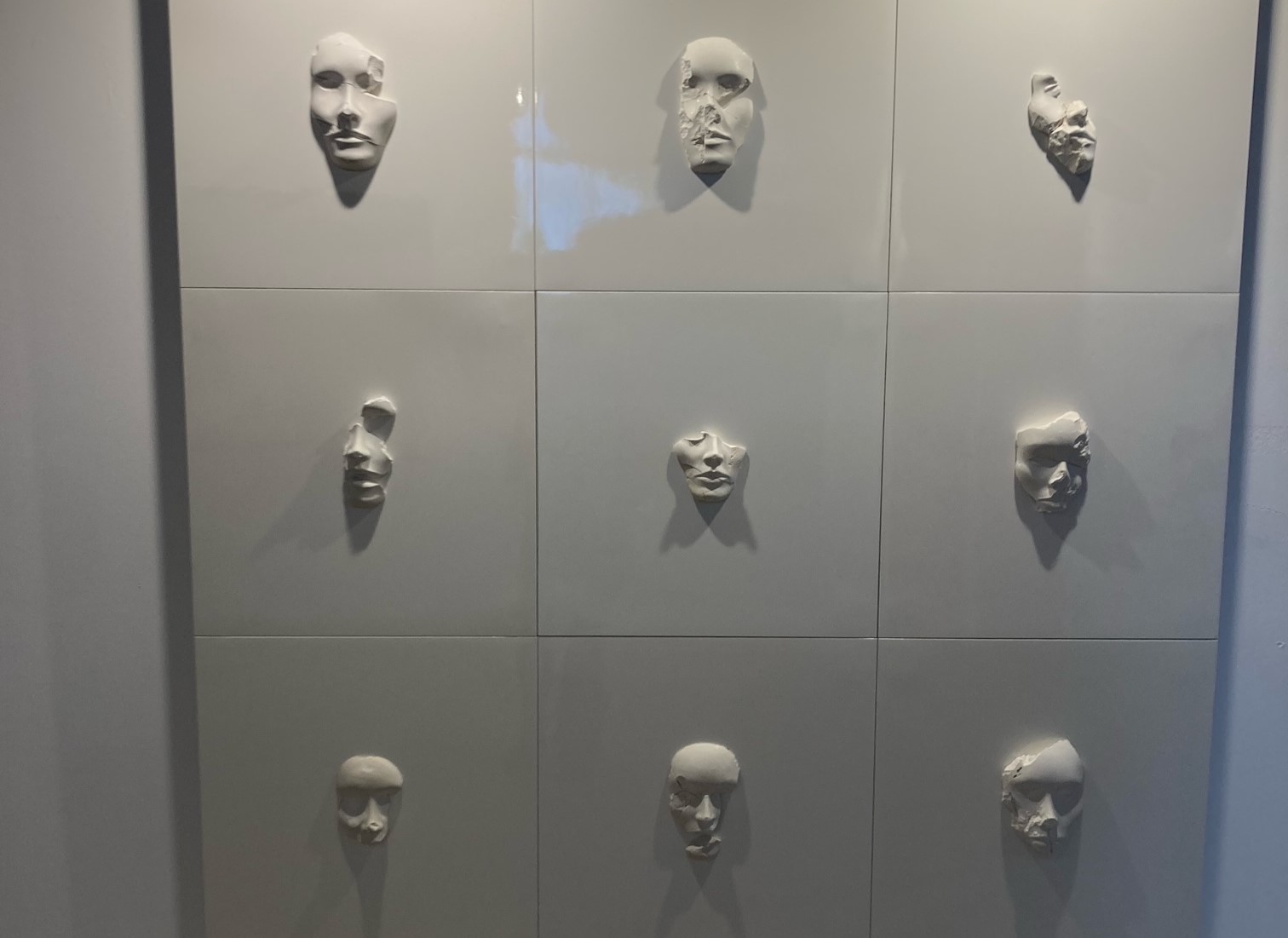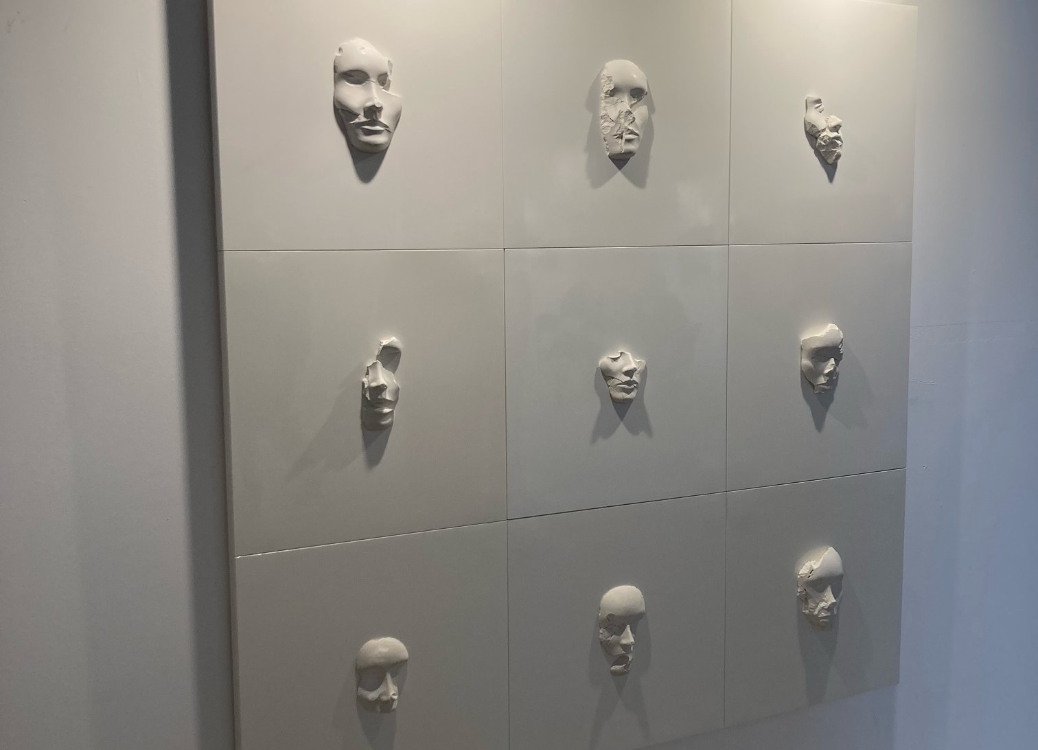 L’opera di Anghelopoulos (gesso su pannelli, 145x145 cm, 2022) si presenta come un’ampia soglia, potale, addossata a parete. I volti feriti sfregiati dal dolore sembrano emergere dalle singole finestre-celle che li isolano l’uno dall’altro. L’opera sottolinea la persistente fragilità e la condizione di isolamento dell’uomo, vissute in questi ultimi anni tra pandemia e guerre, per nulla risolte dall’immenso progresso tecnologico.