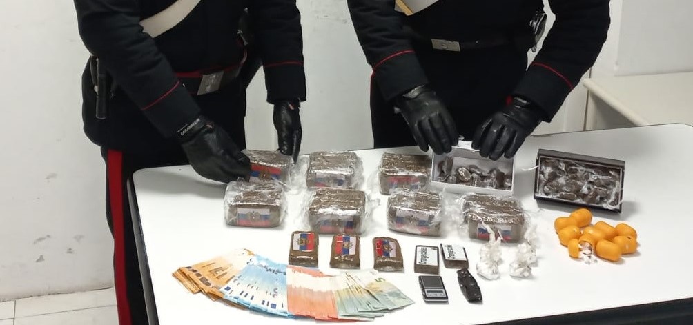 Sequestrati 300 dosi di cocaina confezionati in involucri termosaldati, 40 panetti da 100 grammi l’uno e 62 dosi di hashish e 2mila euro in contanti.