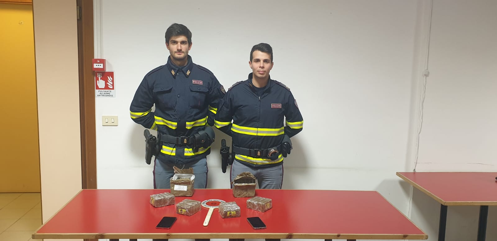 La droga era nascosta in due panetti di cellophane, all'interno di un sottofondo.
