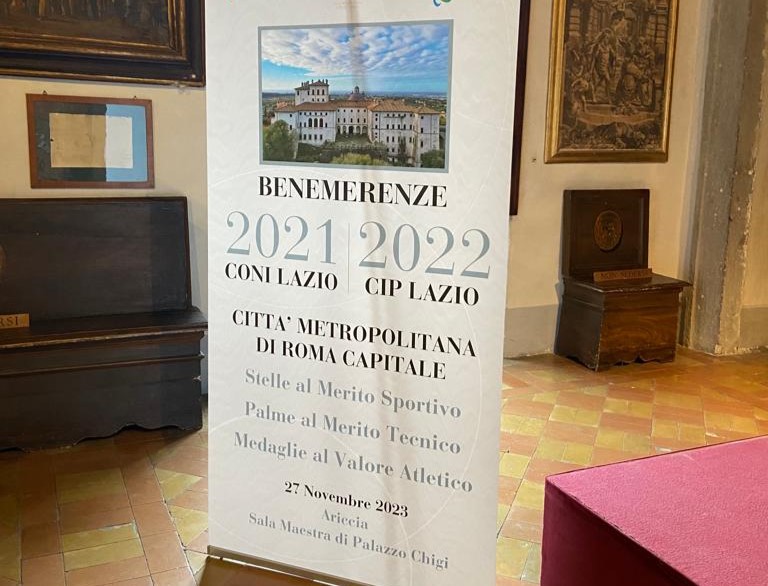 Si è svolta lunedì 27 novembre, nella meravigliosa cornice della Sala Maestra di Palazzo Chigi di Ariccia, la Cerimonia di Consegna delle Benemerenze Sportive del CONI Lazio relative all’anno 2021 e del CIP Lazio relative all’anno 2022 per dirigenti, tecnici e atleti della Città metropolitana di Roma Capitale.