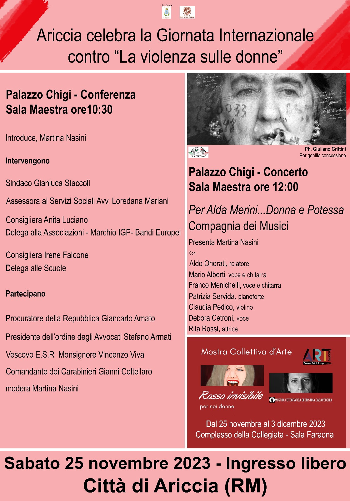 L'evento a Palazzo Chigi di Ariccia rappresenta un passo avanti significativo nella lotta contro la violenza sulle donne ed un impegno concreto per porre fine a questa piaga sociale e per creare un futuro in cui ogni donna possa vivere senza paura, in cui sia rispettata la sua dignità e in cui sia garantita la sua sicurezza. Seguirà un meraviglioso concerto, realizzato dall’Associazione La Terzina, dedicato alle donne e ad Alda Merini: donna e poetessa.”