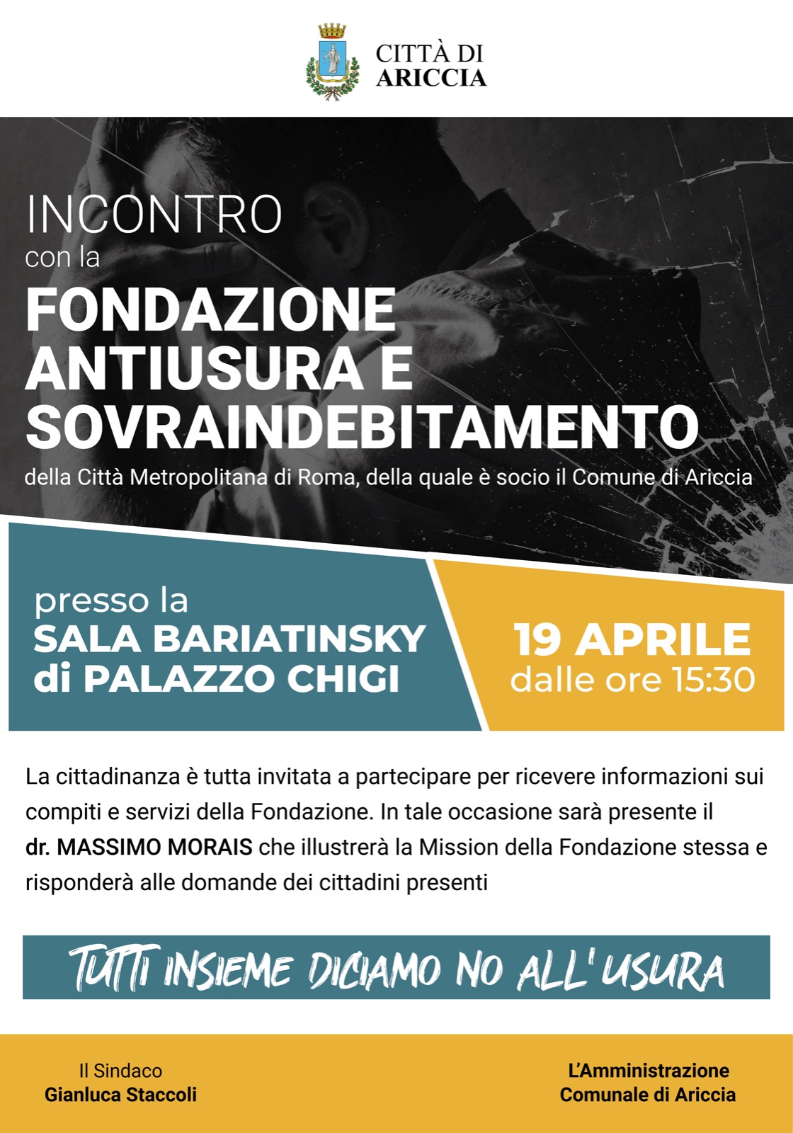 Mercoledì 19 aprile, alle ore 15.30 si svolgerà ad Ariccia, all’interno della Sala Bariatinsky di Palazzo Chigi , un incontro con la Fondazione Antiusura e Indebitamento della Città Metropolitana di Roma, della quale è socio il Comune di Ariccia.