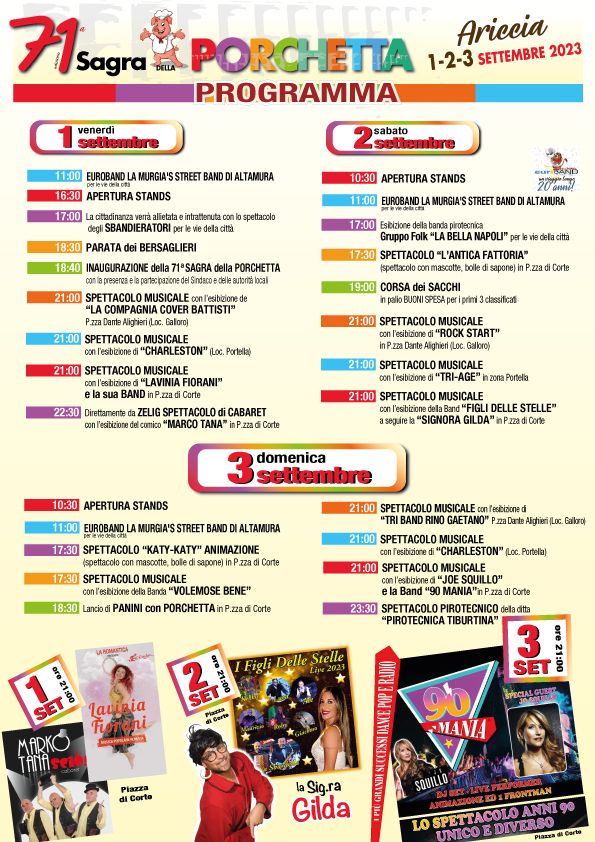 Spettacoli musicali, animazione e cabaret andranno ad animare quest’anno la Sagra della Porchetta ad Ariccia.