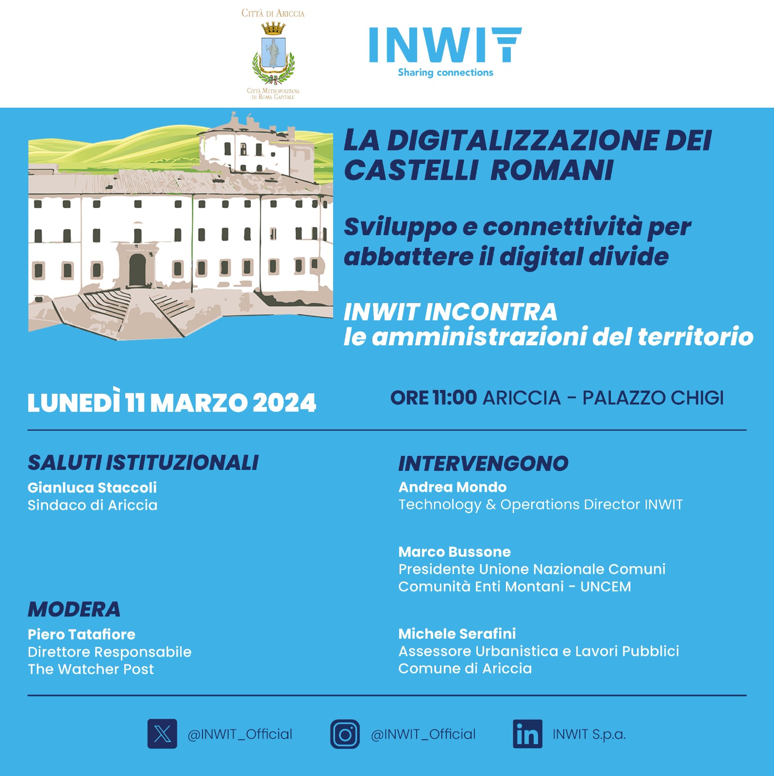 Il comune di Ariccia, in collaborazione con Inwit, principale tower operator italiano, promuove una tavola rotonda per raccontare il ruolo delle infrastrutture digitali e condivise, in ottica di sviluppo sostenibile dei territori e delle aree interne.