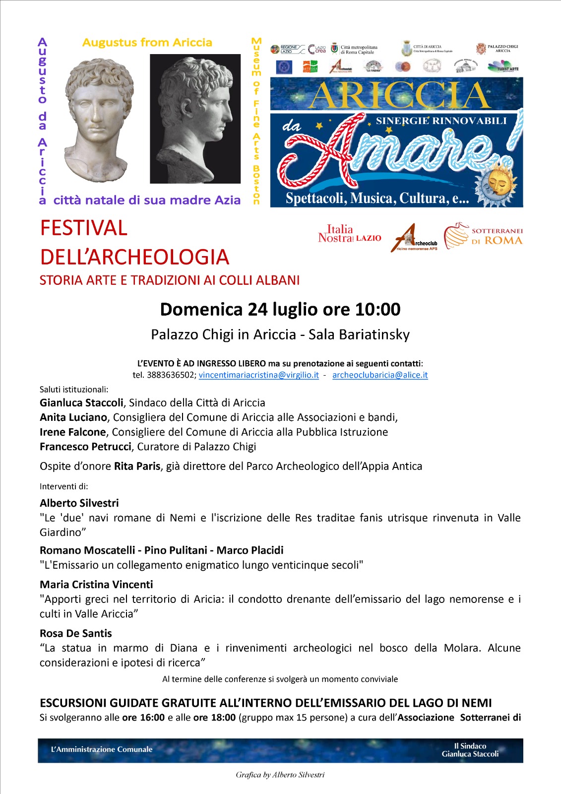 Il Festival, ideato da Maria Cristina Vincenti (Presidente di Archeoclub Aricino Nemorense, socia di Italia Nostra e componente del dipartimento archeologia Lazio), che si svolgerà Domenica 24 luglio nella splendida dimora barocca di Palazzo Chigi, ha registrato il tutto esaurito sia al convegno che alle escursioni, e sarà uno dei protagonisti dell’estate ariccina.