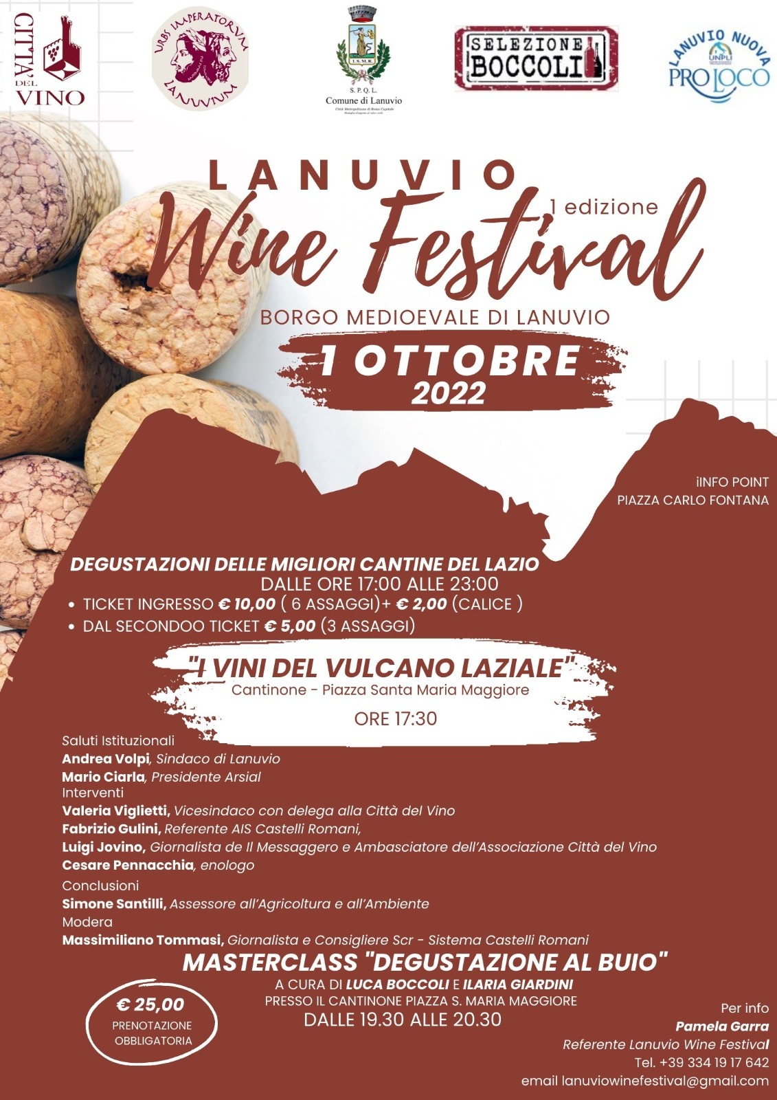 Durante la manifestazione è previsto anche un convegno dal titolo “I Vini del Vulcano Laziale” seguito da una Masterclass molto particolare: “Degustazione al buio” a cura di Luca Boccoli e Ilaria Giardini. Al convegno interverranno oltre al Sindaco di Lanuvio Andrea Volpi, anche la Vice Sindaco con delega alla Città del Vino Valeria Viglietti, l’Assessore all’agricoltura e all’ambiente Simone Santilli, il Presidente di Arsial Mario Ciarla , il Referente AIS Castelli Romani Fabrizio Gulini, il giornalista e Ambasciatore dell’Associazione “Città del Vino” Luigi Jovino e l’enologo Cesare Pennacchia. L’incontro sarà moderato da Massimiliano Tommasi giornalista e consigliere SCR – Sistema Castelli Romani.