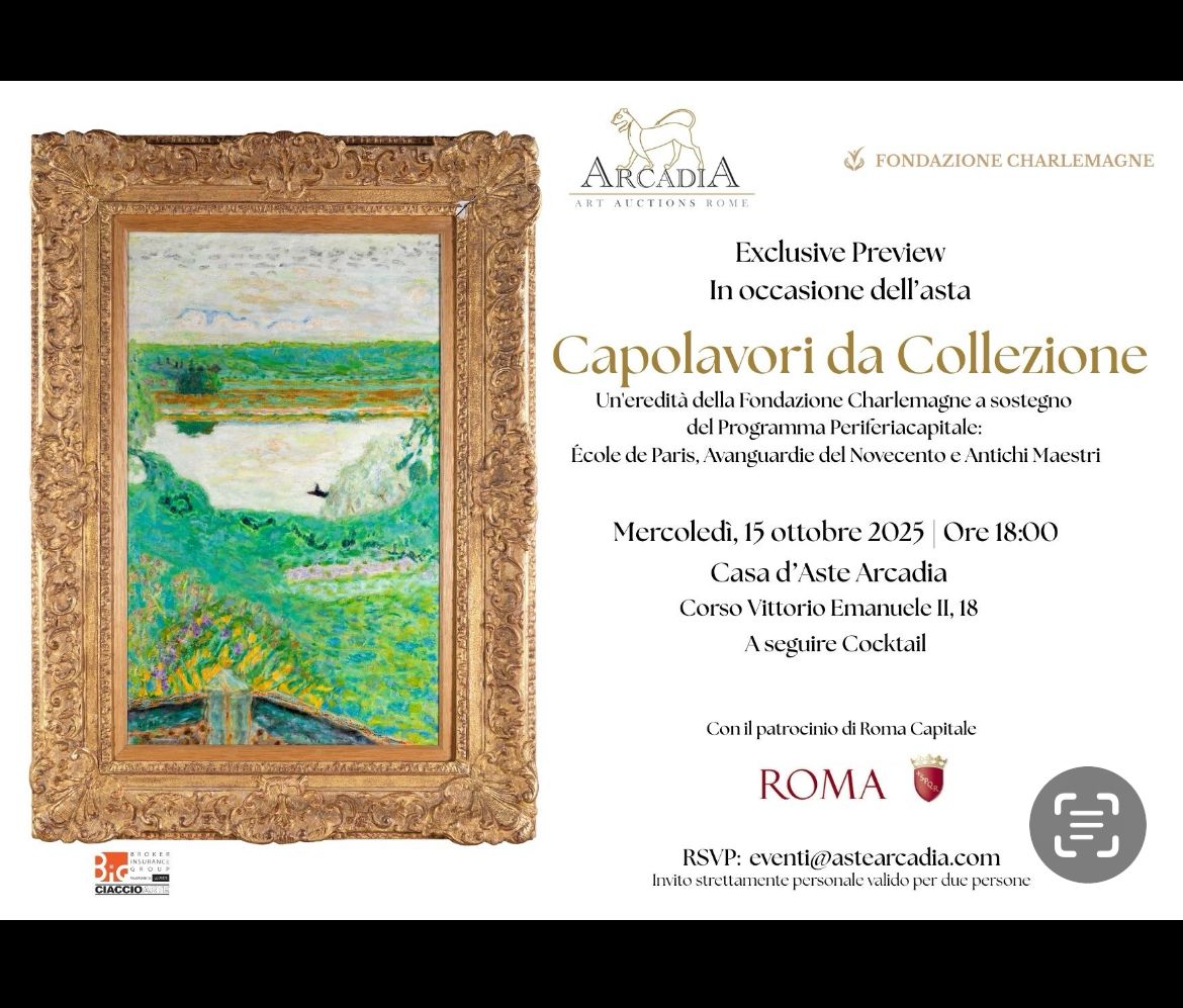 “Sarà un evento – afferma Massimo Tagliatesta, direttore di Arcadia – in cui il collezionismo incontra la solidarietà, e la bellezza diventa occasione di rinascita per le periferie”. “La collaborazione con Arcadia ci permetterà di trasformare un lascito di bellezza in energia viva per la città – dichiara Stefania Mancini, presidente di Fondazione Charlemagne – il ricavato sosterrà percorsi di rigenerazione urbana e sociale che nascono dalle periferie e che raccontano la visione di una Roma più solidale, coesa e inclusiva”.