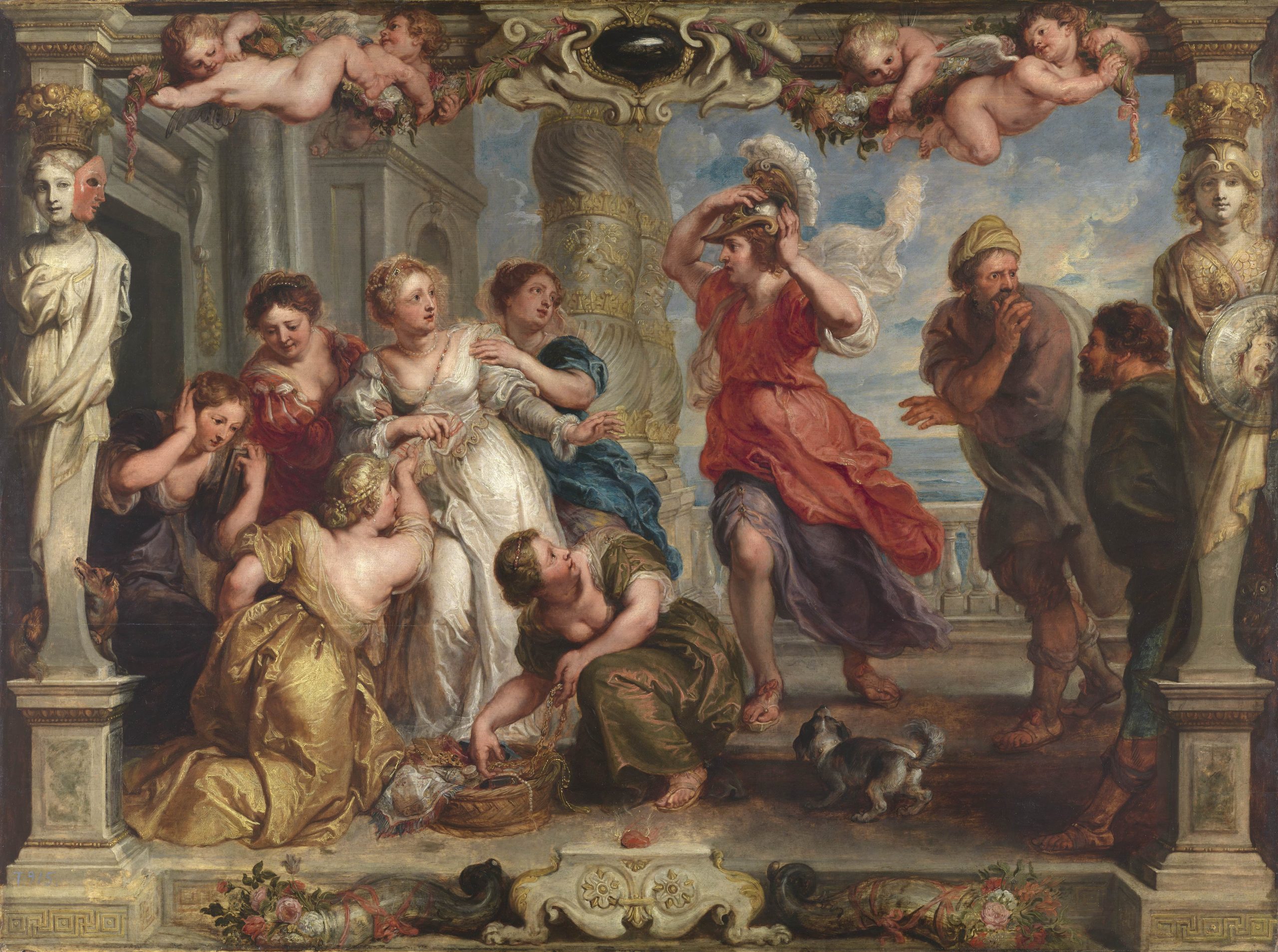 A questo proposito, si inserisce bene nel percorso espositivo una serie di opere in cui Rubens interpreta la figura di Achille – emblema dell’eroismo dell’essere umano, capace di scrivere la storia pur nella sua finitezza mortale –, come l’Achille scoperto da Ulisse tra le figlie di Licomede del Prado, in cui emerge chiaramente il riferimento a quanto visto a Palazzo Te nella la posa della fanciulla seduta di spalle in primo piano, che è la stessa di una presente nel Banchetto rustico della Sala di Psiche.