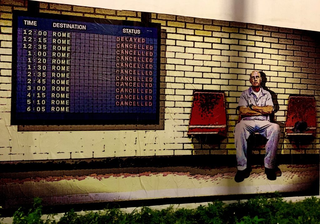Un uomo con la divisa da carcerato, seduto nella sala d’aspetto di un aeroporto, attende un volo per Roma che, però, non parte mai. Sui display appare sempre la scritta “Cancelled”, “cancellato”.
