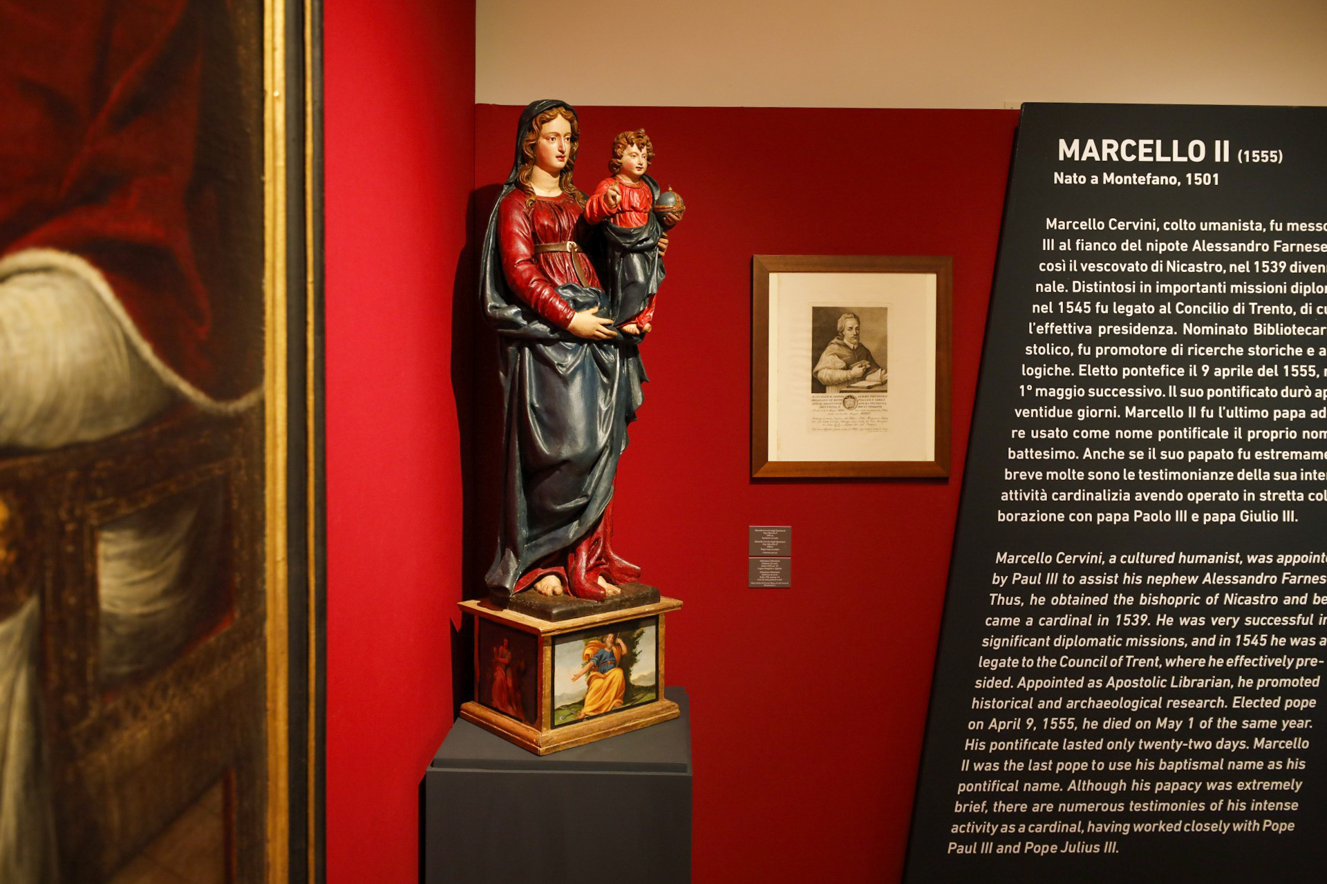 La mostra è divisa in 3 sezioni: nella prima il racconto dei papi attraverso biografie ed elementi che li contraddistinguono come ritratti, medaglie, oggetti legati alla loro committenza. Nella seconda i santi e i beati (San Marcellino, San Nicola da Tolentino, il Beato Sante, San Giacomo della Marca, Santa Camilla Battista da Varano, San Giuseppe da Copertino, Santa Veronica Giuliani, Santa Maria Goretti) attraverso incisioni, quadri, oggetti di culto e di valore spirituale.