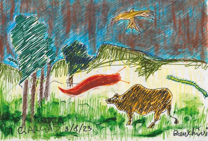 Rilegato a mano, contenente 30 disegni, è il frutto della residenza d’artista per la quale è stato selezionato Bruschini nel 2023 nella regione di Occitania, in Francia. L’artista ha percorso più di 7000 km durante questo viaggio, visitando tutte le più importanti caverne con la pittura rupestre paleolitica che si trovano in questa zona, comprese le Grotte di Lascaux, il complesso di grotte situato nella Dordogna.