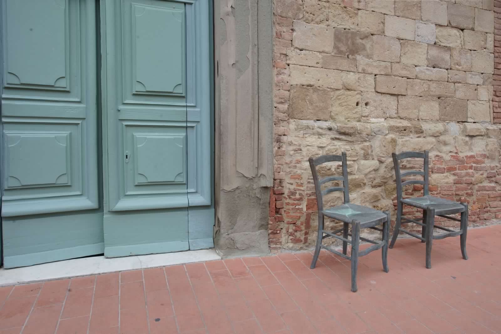 Primo video mai realizzato da Corsini, Here everyday interagirà con lo spazio esterno, e in particolare con il vento, che determinerà la velocità del movimento. Il silenzio che avvolgerà lo spazio interno potrà sciogliersi, invece, grazie alla terza opera (Welcome chairs, 2023), collocata sulla via, a fianco della porta d’ingresso. Una coppia di sedie in bronzo, invito alla sosta e alla conversazione, al dialogo, alla partecipazione del visitatore del Padiglione così come dell’abitante del quartiere e del passante casuale, persino quello che non sappia - o non si accorga - di essere sulla soglia di uno spazio espositivo. Una scultura in cui la narrazione diventa fatto architettonico.