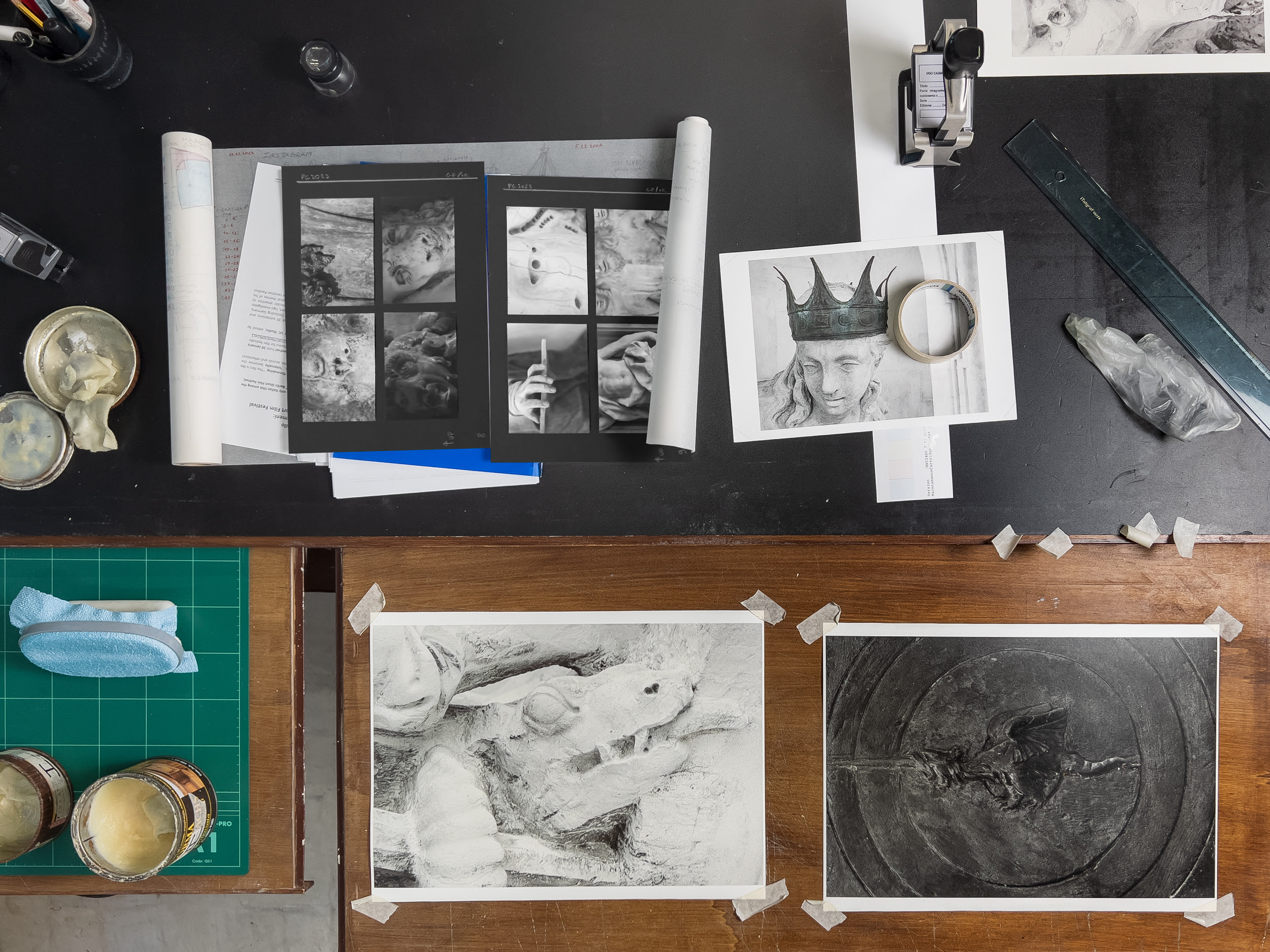 “Con spirito ruskiniano Carmeni si è inerpicato sui ponteggi dei molti cantieri di restauro delle facciate delle chiese e dei palazzi veneziani e ha osservato, annotato, analizzato, mappato, fotografato e infine selezionato, tra i molti scatti, quelli necessari alla propria personalissima narrazione”, spiega Daniela Ferretti, curatrice della mostra. “Quello di Ugo è un pellegrinaggio onirico fatto di trabocchetti e prodigi, meraviglie e incubi, corrosioni e superfici levigate, vertiginosi e iperbolici scorci architettonici, inquietanti e fascinose personificazioni allegoriche, mirabili lapidari e fantastici bestiari. Con dettagli illuminanti Ugo Carmeni ci squaderna davanti una polifonia di simboli semantici inattesa e insospettata che invita all’osservazione più attenta e ci guida alla scoperta di un ‘mondo intermedio’”.