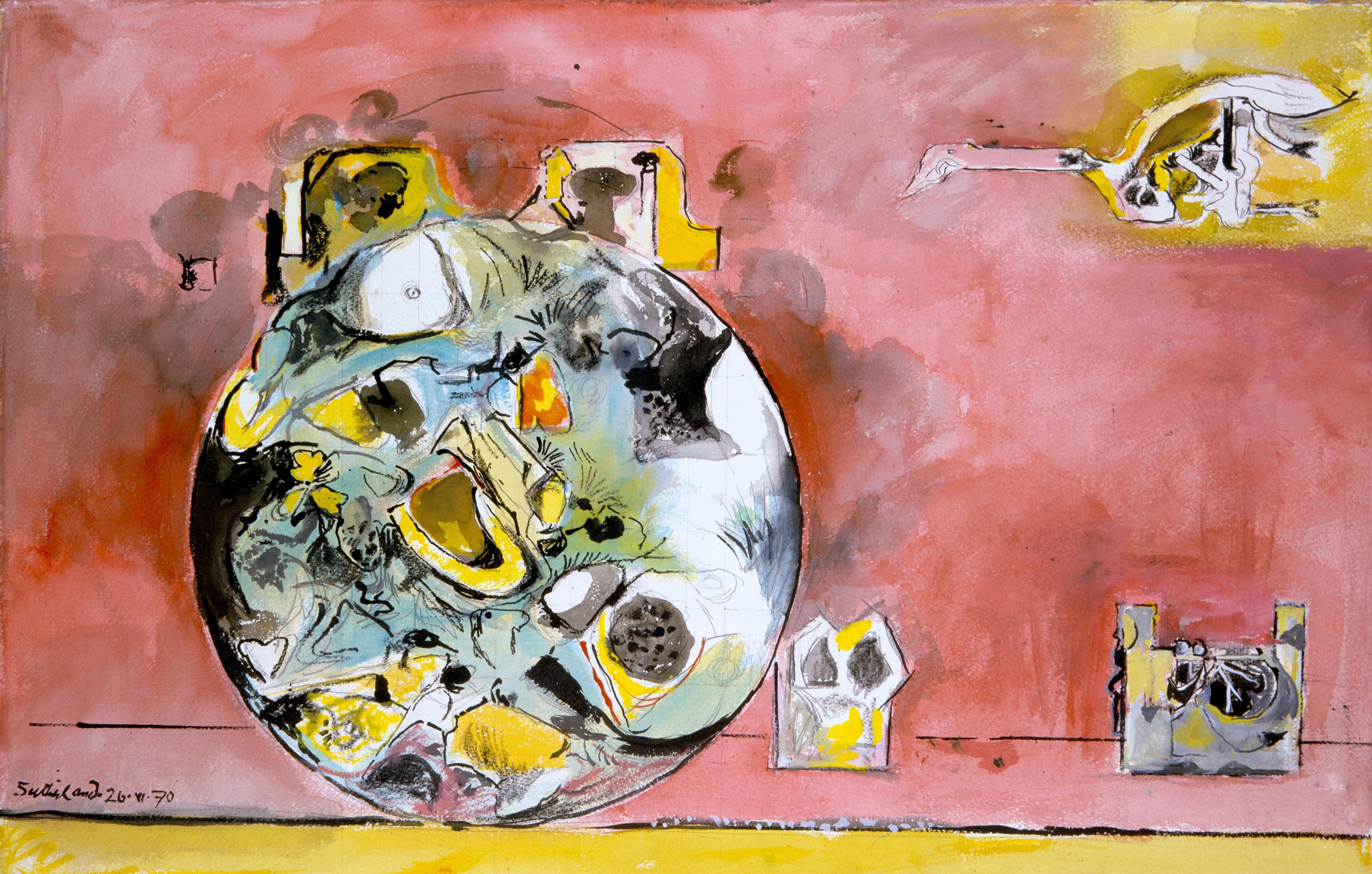 Sempre in bilico tra reale e immaginario, le creazioni misteriose di Sutherland si muovono a latere del surrealismo e ci immergono in un “magico disagio”, per usare le parole di Francesco Arcangeli, caratterizzato da allusive metamorfosi e dalla tensione di forze opposte che, nel loro equilibrio sempre instabile, danno vita a un “giallo” di cui non conosceremo mai la conclusione.