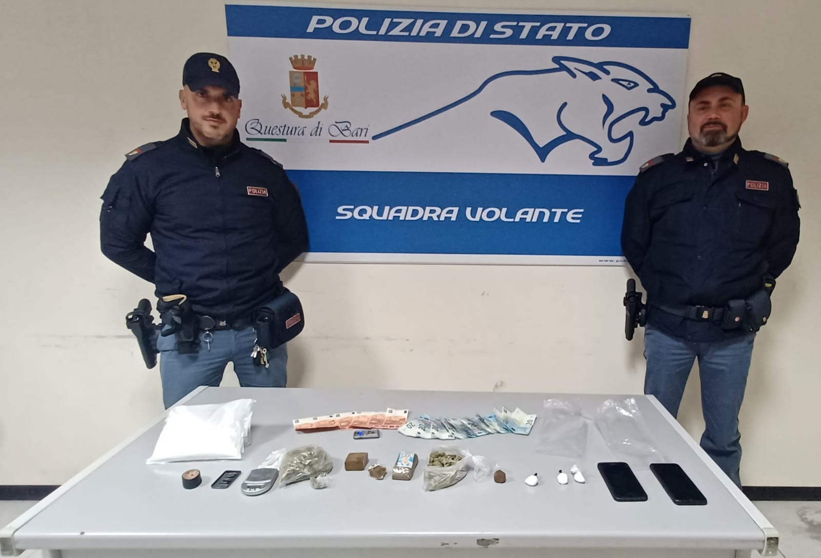 Contestualmente, una seconda pattuglia della Squadra Volante ha proceduto alla perquisizione personale e domiciliare del secondo fermato, con esito negativo. Rinvenuta una modica quantità di sostanza stupefacente ad uso personale, per la quale l’interessato è stato segnalato ai sensi dell’art. 75 all’autorità amministrativa. L’arrestato, su disposizione dell’A.G., è stato condotto nel carcere di Trani; il giudice ha convalidato il provvedimento pre-cautelare, nel contraddittorio con la difesa.