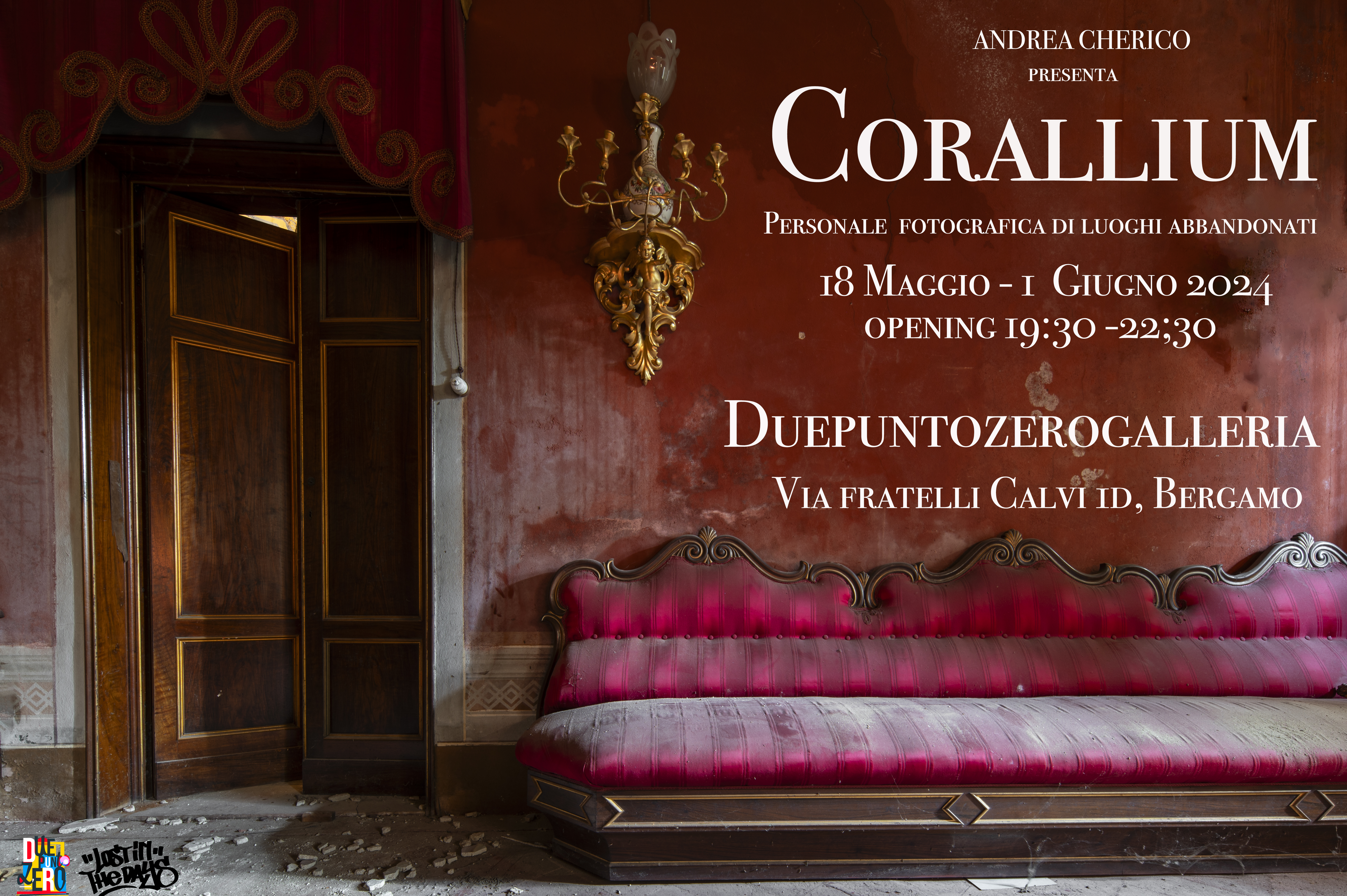 “Corallium” è il titolo della personale fotografica di luoghi abbandonati presentata da Andrea Cherico che, dal prossimo 18 maggio al 1 giugno 2024, sarà ospitata presso la Galleria Duepuntozerogalleria, a Bergamo, in Via Fratelli Calvi 1/d. In mostra 20 opere identificate dal nome e dal colore di un corallo.