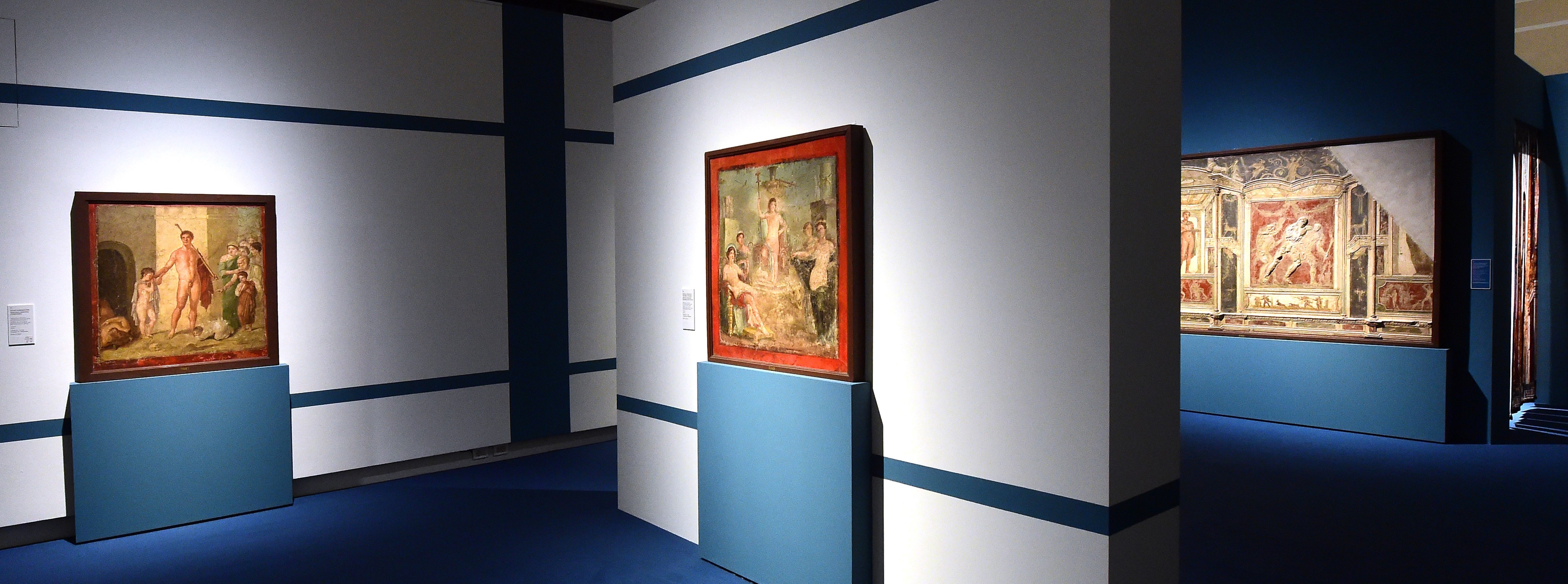A Bologna, per la prima volta, viene esposto un corpus di straordinari esempi di pittura romana provenienti da quelle domus celebri proprio per la bellezza delle loro decorazioni parietali, dalle quali spesso assumono anche il nome con cui sono conosciute. Capolavori - solo per citarne alcuni - dalle domus del Poeta Tragico, dell'Amore punito, e dalle Ville di Fannio Sinistore a Boscoreale, e dei Papiri a Ercolano.