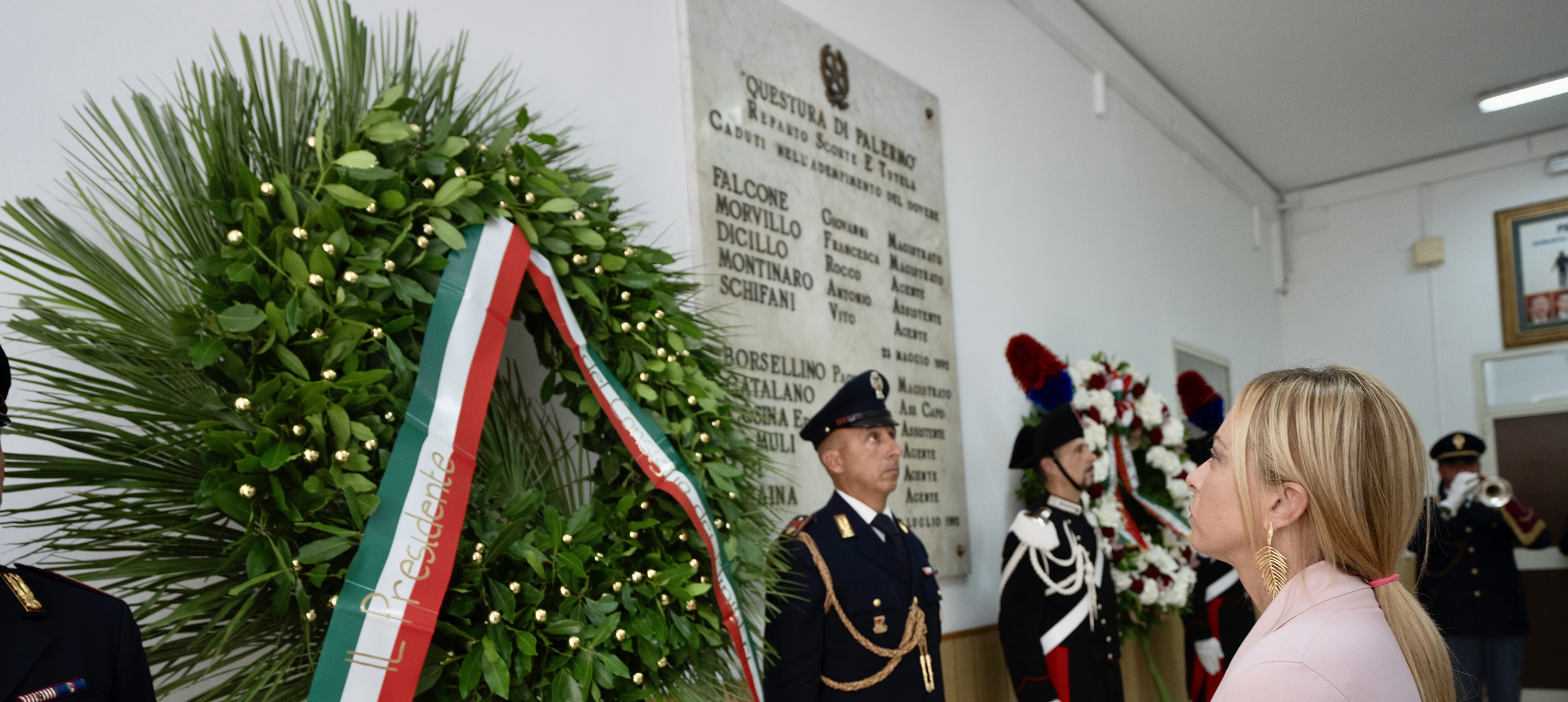 Dopo aver salutato il Capo della Polizia, Vittorio Pisani, la premier ha avuto un incontro con Manfredi Borsellino, figlio di Paolo e poliziotto. Poi, ha deposto una corona per gli agenti della scorta di Borsellino - Agostino Catalano, Emanuela Loi, Vincenzo Li Muli, Walter Eddie Cosina e Claudio Traina - e si è fermata a parlare con i familiari.