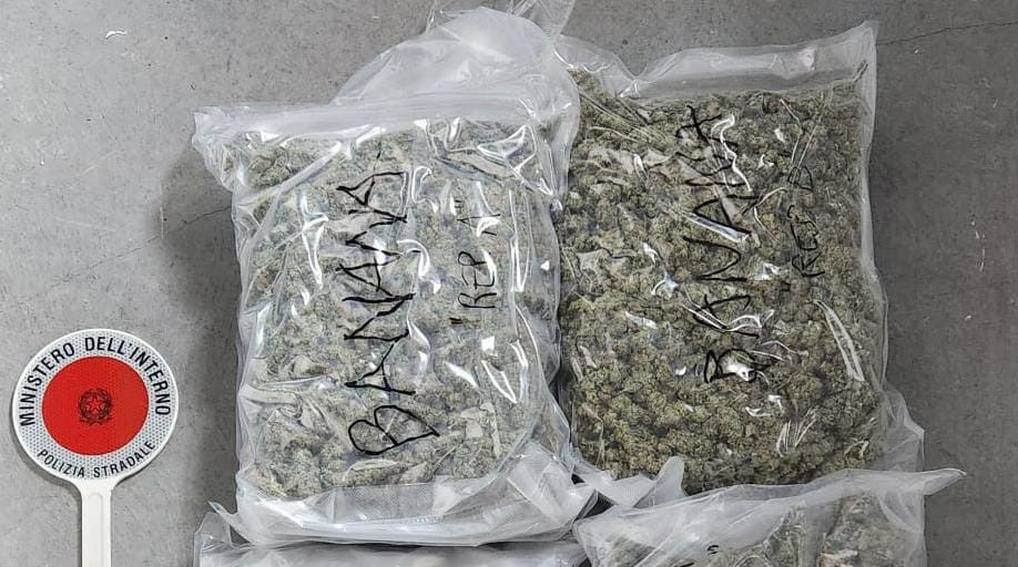Gli agenti hanno immediatamente sentito un intenso odore di sostanza stupefacente, valutata nell’immediatezza come marijuana. Hanno aperto il sacco in plastica accertando al suo interno 4 confezioni di plastica trasparente, sottovuoto, contenenti sostanza erbacea, successivamente accertata per un peso lordo di 4320,48 grammi di marijuana.