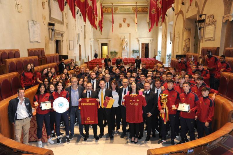 La Presidente dell’Assemblea Capitolina Svetlana Celli, insieme ai consiglieri capitolini Daniele Parrucci e Federico Rocca, componenti del Roma Club Campidoglio, ha premiato questa mattina in Aula Giulio Cesare le squadre Primavera femminile e maschile dell’As Roma, rispettivamente vincitrici dello scudetto 2023 e della Coppa Italia.