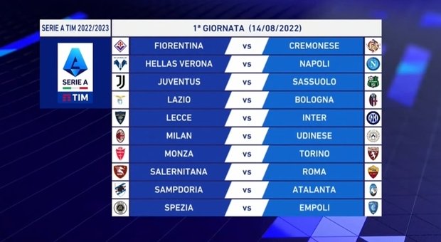 La nuova stagione comincerà sabato 13 agosto con Fiorentina-Cremonse, Hellas Verona-Napoli, Juventus-Sassuolo, Lazio-Bologna, Lecce-Inter, Milan-Udinese, Monza-Torino, Salernitana-Roma, Sampdoria-Atalanta, Spezia-Napoli. Per la terza giornata, che si terrà il 28 agosto, invece, sono in programmma i primi big match, con Juventus-Roma e Lazio-Inter.