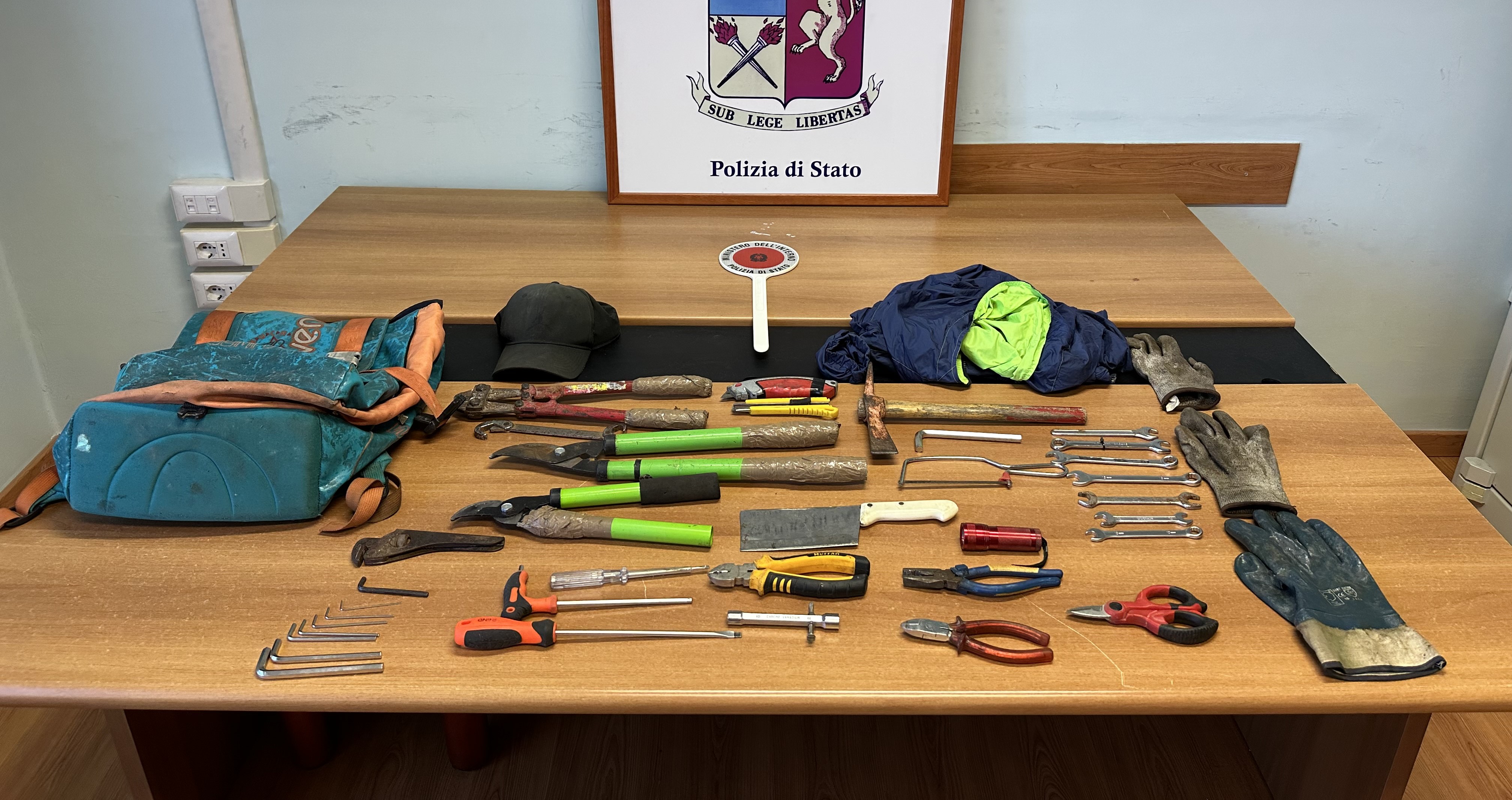 A bordo del veicolo, dalla successiva perquisizione, si rinveniva uno zaino contenete numerosi utensili e attrezzi specifici per tranciare i suddetti cavi elettrici nonché circa 60 metri di cavo tripolare di diametro industriale contenente rame.