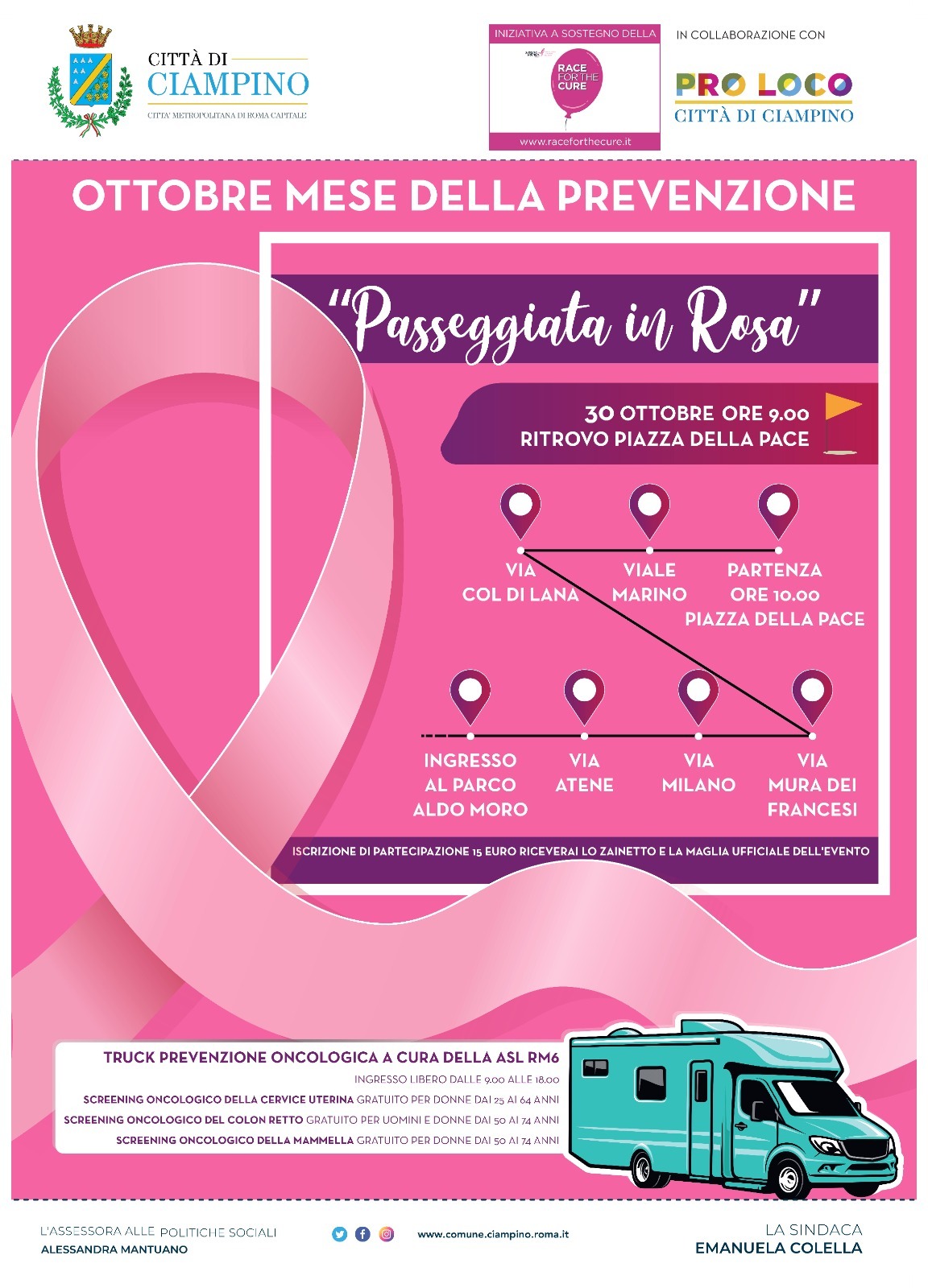 La “Passeggiata in rosa”, evento aperto a tutti, in programma domenica 30 ottobre, organizzata in collaborazione con la Pro Loco, prenderà il via da piazza della Pace e seguirà il seguente itinerario: piazza pace, via di Marino, via col di Lana, via Mura dei Francesi, via Milano, via Atene e ingresso al Parco Aldo Moro.