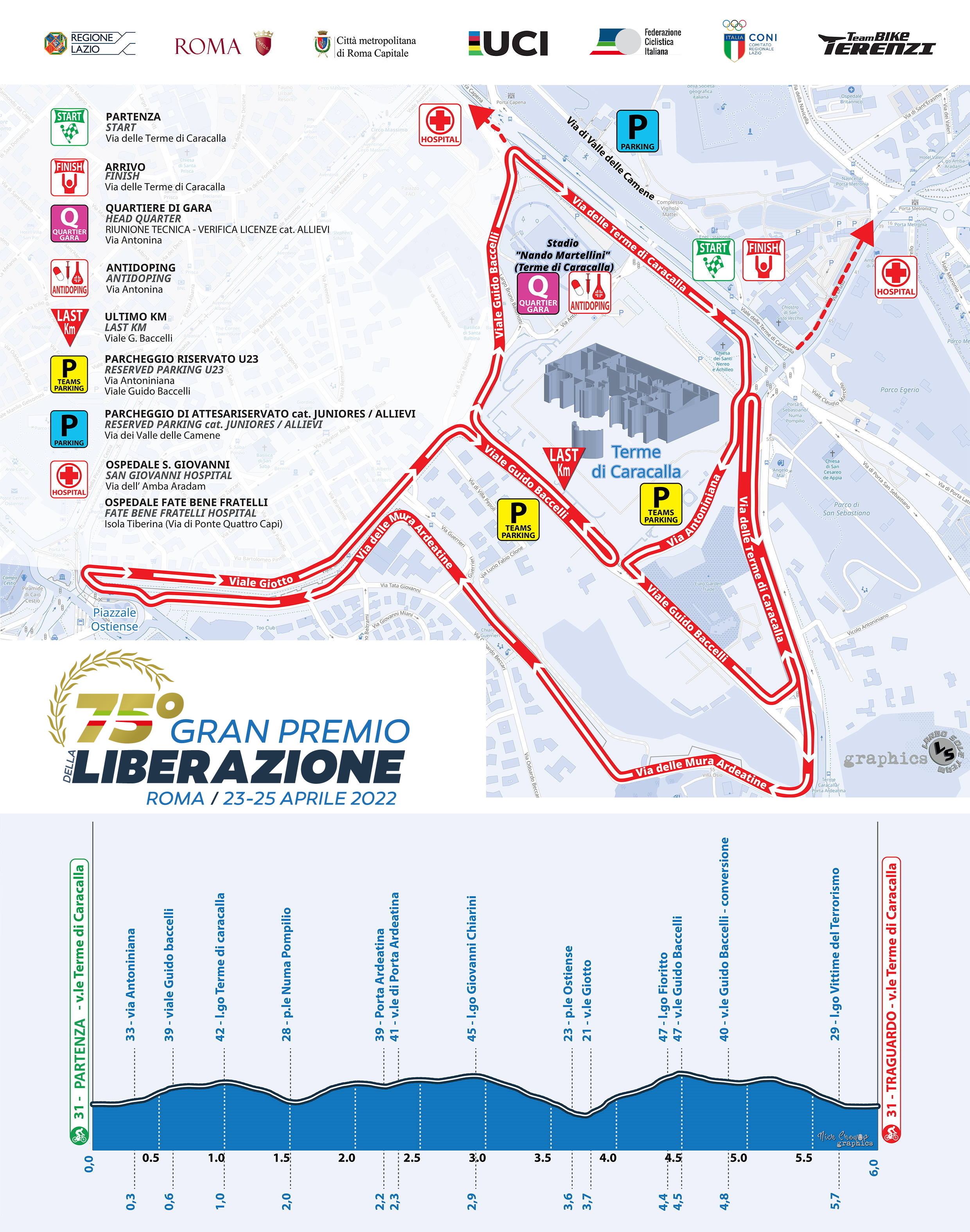 Un’altra ascesa è quella che caratterizza Viale Giotto per rientrare nella zona delle Terme di Caracalla e riportare gli atleti al traguardo. Un percorso quello del Liberazione che, ripetuto più volte diventa davvero impegnativo pur senza avere dislivelli particolari, tanto è vero che spesso la gara si è risolta con fughe di pochi corridori capaci di anticipare il gruppo.