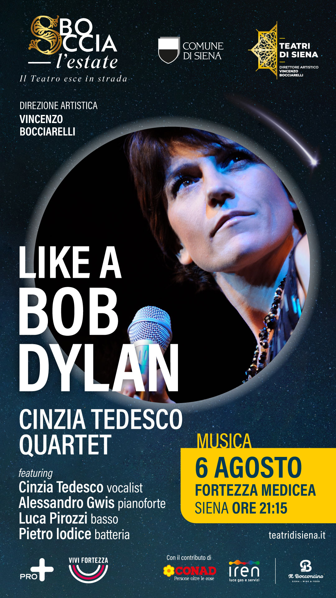 Grande successo alla Fortezza Medicea di Siena per lo spettacolo “Like a Bob Dylan” portato in scena dal Cinzia Tedesco Quartet nell’ambito della rassegna estiva Sboccia l’Estate 2025, sotto la direzione artistica di Vincenzo Bocciarelli. L’evento, organizzato dai Teatri di Siena in collaborazione con il Comune di Siena, ha rappresentato uno dei momenti più attesi del cartellone musicale estivo.