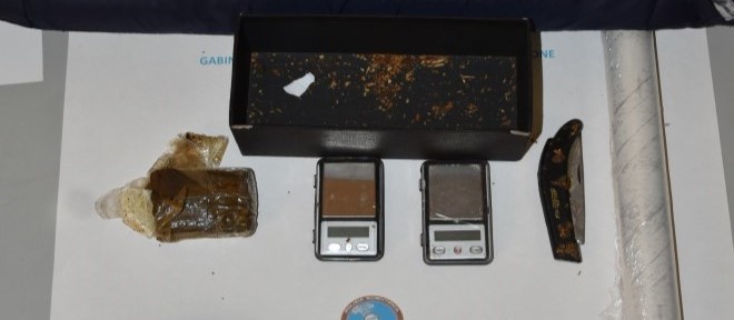 Sequestrati un panetto di hashish, due bilancini elettronici, un coltello e materiale per confezionare le dosi.