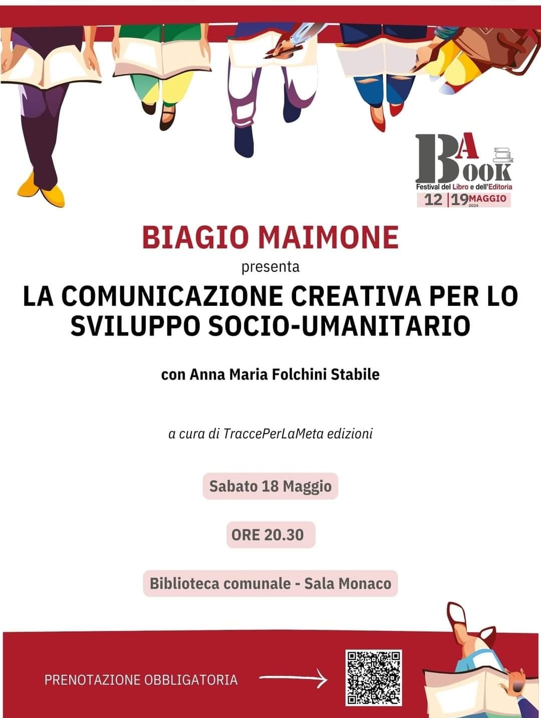 Il giornalista Biagio Maimone parteciperà al Festival del Libro e dell’Editoria "Ba Book", che si tiene dal 12 al 19 maggio, a Busto Arsizio. Presenterà, sabato 18 maggio , alle ore 20.30, nella Biblioteca Comunale - Sala Monaci, il suo saggio intitolato "La Comunicazione Creativa per lo sviluppo socio-umanitario".