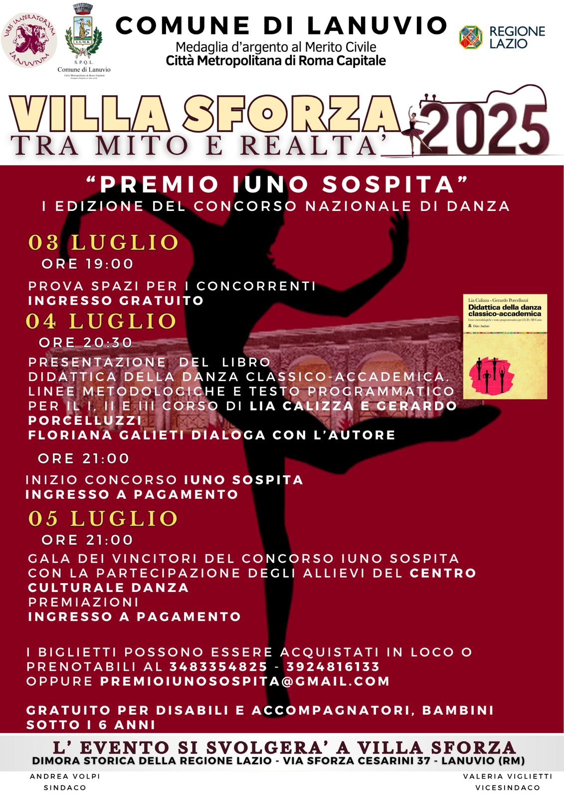 Dal 3 al 5 luglio 2025, la splendida cornice di Villa Sforza Cesarini ospiterà il "Premio Iuno Sospita", prima edizione del concorso nazionale di danza promosso dal Comune di Lanuvio nell’ambito del progetto "Villa Sforza tra mito e realtà", con il contributo della Regione Lazio.